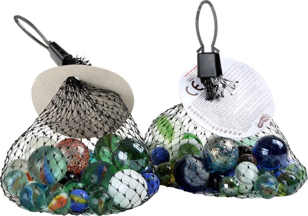 Ze skla v rozdílných velikostech a barvách. V balení je jedna síťka se 40 kuličkami. Německá firma Legler zaměřená na výrobu kvalitních dřevěných hraček od roku 1996. Všechny dřevěné hračky značky small foot mají označení CE a jsou vyráběny dle evropské normy pro bezpečnost hraček EN 71. Použité barvy jsou speciálně vyvinuty pro dřevěné hračky a jsou odolné i proti slinám dětí. Dřevo, které se používá pro tyto hračky, většinou pochází z lesnických společností zapojených do zalesňování. To nabízí všem zákazníkům možnost přispět k zachování přirozeně rostoucích lesů. Dřevěné hračky small foot jsou zářivě barevné produkty, které jsou vyrobeny převážně z přírodních surovin - dřeva. Dětem dělají radost od útlého věku, rozvíjí jejich hmatové a smyslové dovednosti. Cílem značky small foot je podporovat duševní a fyzický vývoj dětí.