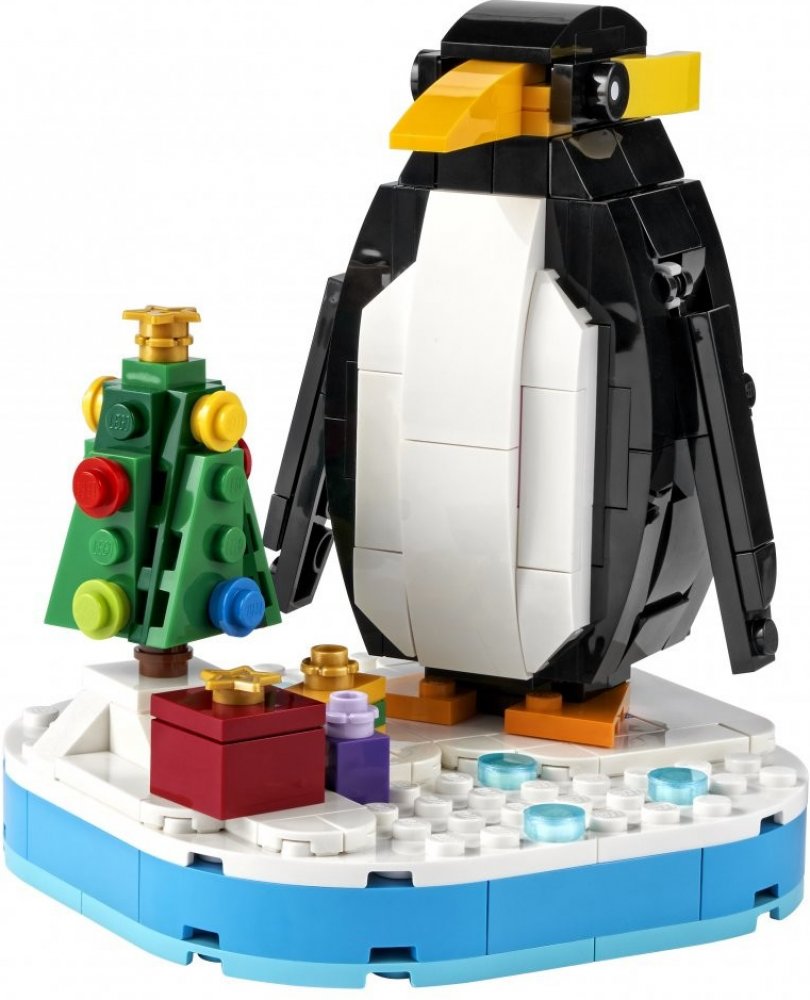 Skvělá stavebnice s LEGO® modelem tučňáka na výstavní podložce s vánočním stromkem a 3 zabalenými dárky.