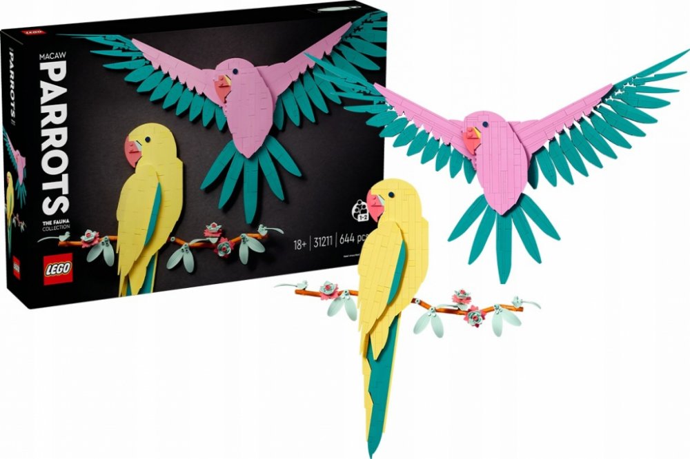Přineste si domů kousek přírody s barevnou stavebnicí Kolekce zvířat – Papoušci ara. Sada představuje perfektní dárek pro milovníky bytových doplňků a dospělí stavitelé si s ní vytvoří 2 úchvatně barevné papoušky. Toto umělecké dílo z kostek LEGO nepotřebuje rámeček a je určené na vystavení na zdi. Nemá vlastní stojánek. Toto stylové trojrozměrné umělecké dílo představuje 2 papoušky ara – žlutého sedícího na větvičce s květy a růžového v letu s roztaženými křídly. Součástí stavebnice jsou 2 návody na stavění a fanoušci LEGO si modely papoušků postaví sami nebo si u nich odpočinou s blízkými.