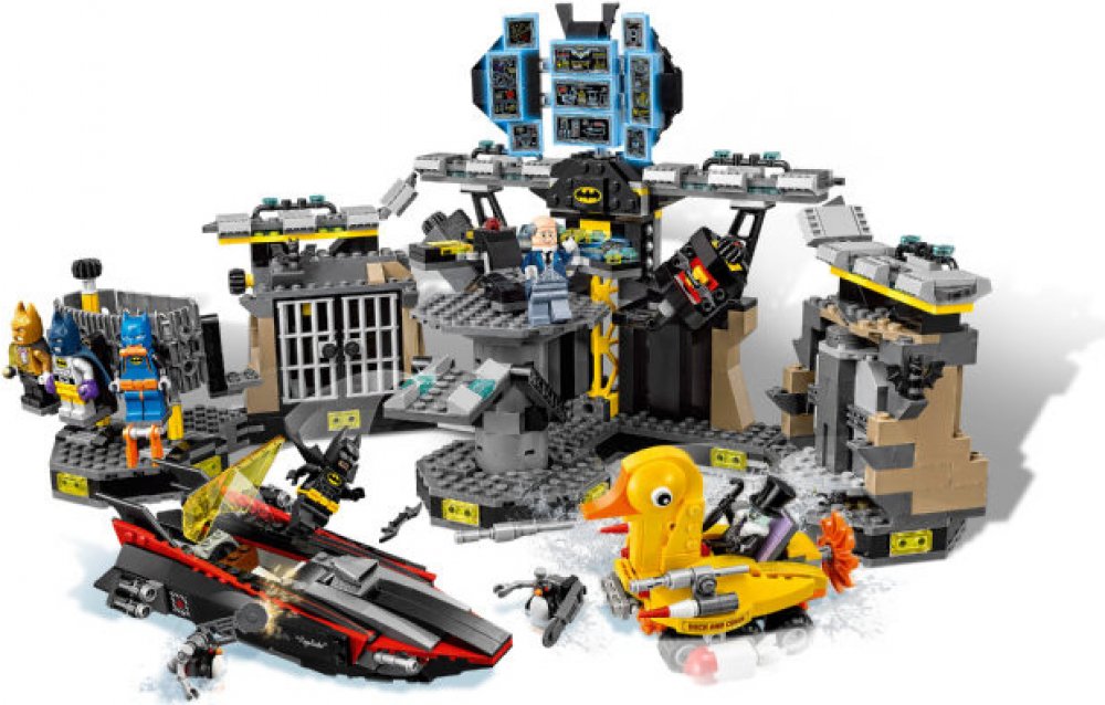 Ochraňuj jeskyni Batcave před útokem Tučňáka! Braň se před Tučňákovou invazí v Duckmobilu do jeskyně Batcave v sadě LEGO® BATMAN MOVIE: Vloupání do Batcave. Detailně propracovaná jeskyně Batcave obsahuje otáčecí místnost pro přeměnu Bruce Waynea na Batmana, otáčecí kontrolní centrum s Batcomputerem s mnoha obrazovkami a funkcí zvedací plošiny, a vězení s funkcí vyhození stěny do povětří. Jeskyně Batcave má také otáčecí skříň s náhradními obleky - potápěčským oblekem Scu-Batsuit, odolným oblekem Batsuit a oblekem Batsuit s Bat-tryskami - z nichž všechny jsou jako nová těla pro minifigurku Batmana. Začni souboj použitím pružinových raket na lodi Batboat proti dvojitým vystřelovačům a raketovým střelám Duckombilu. Součástí jsou čtyři minifigurky a navíc dvě figurky stoupenců Tučňáka.