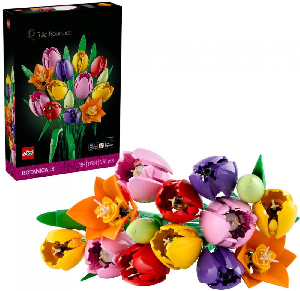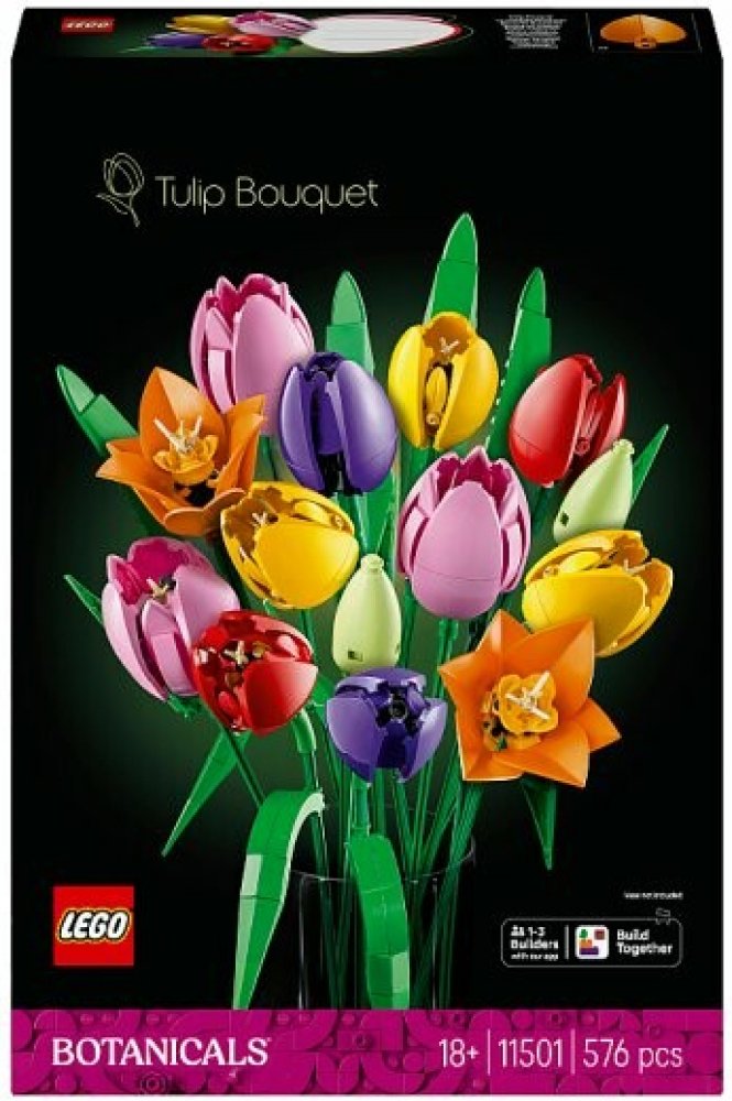 Zkrášlete svůj domov nádhernou květinovou dekorací s LEGO® Botanicals Tulipánovou kyticí (11501) určenou pro dospělé! Tato LEGO kytice oslavující jarní radost a optimismus obsahuje 5 typů tulipánů v různých barvách a stadiích kvetení. Užijte si krásu květin, zatímco tvoříte svěží zelené pupeny, fialové zavřené tulipány a červené, žluté a růžové rozvité tulipány, a přidejte zelené listy, které zvýrazní autentičnost. Květinová sada obsahuje nastavitelné stonky, které umožňují snadné sestavení jedinečné LEGO kytice. Jakmile dokončíte tento zábavný projekt, sada se stane úžasnou květinovou dekorací, která přidá barvu do každé místnosti. Květinová sada může být také vkusným dárkem pro muže i ženy k narozeninám, na Valentýna, na Den matek, k oslavě nového domova nebo pro jakoukoli jinou zvláštní příležitost. Sada je dostupná také v aplikaci LEGO Builder, kde začínající aranžéry najdou digitální návody a mohou sledovat svůj pokrok. Sada obsahuje 576 kusů.
