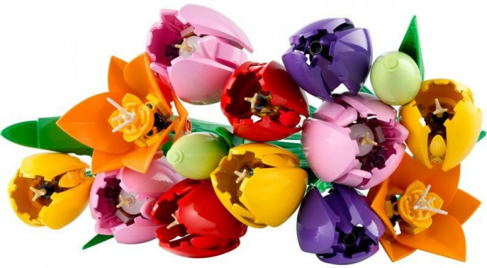 • 5 LEGO® TULIPÁNŮ – Kytice obsahuje 5 tulipánů různých barev a fází kvetení: zelené pupeny, fialové zavřené tulipány a červené, žluté a růžové rozvité tulipány