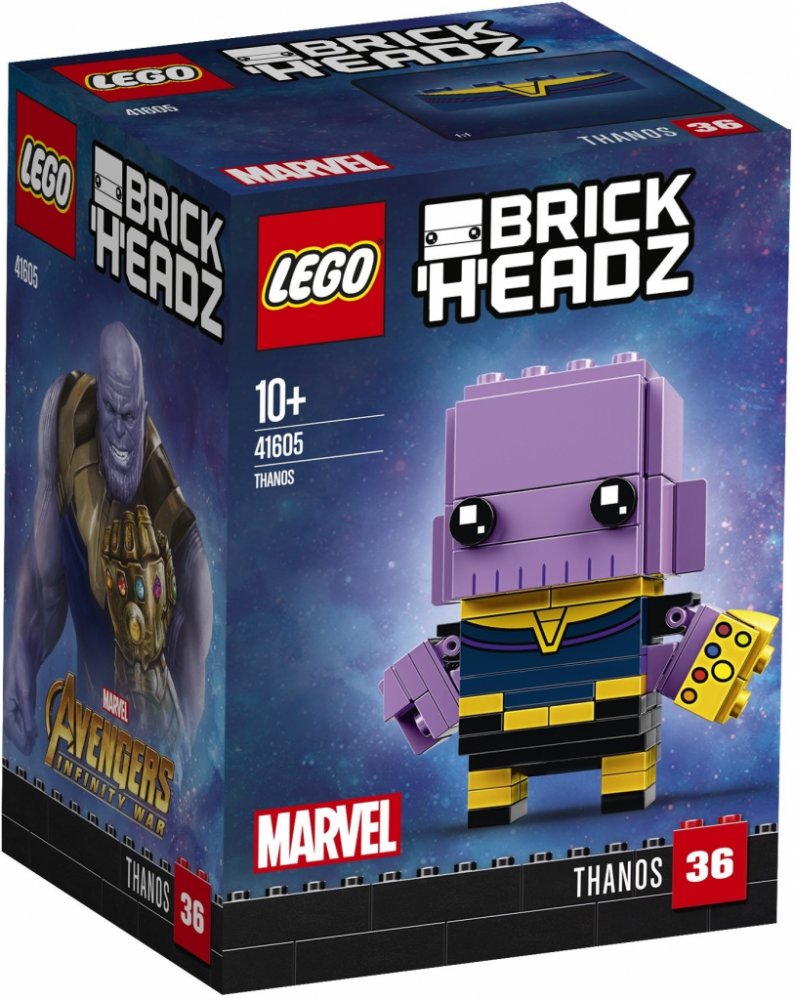 Skládací postavičku Thanose z řady LEGO® BrickHeadz zdobí oči BrickHeadz a autentické detaily z filmového trháku Avengers: Infinity War, včetně Thanosovy fialové pleti, hrudního brnění a Rukavice nekonečna s ozdobami ve stylu Kamenů nekonečna.