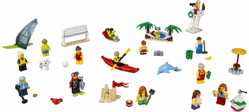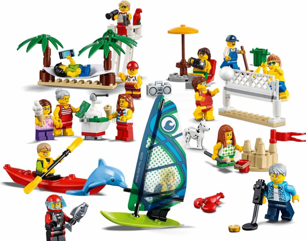 Rozšiř obyvatelstvo svého města s pomocí tohoto balíčku od LEGO® City, ve kterém najdeš velký výběr minifigurek a nekonečné možnosti pro nejrůznější aktivity jako je surfování, jízda na kajaku, hraní volejbalu - součástí balón a síť, dále stromy s houpací sítí a zmrzlinový stánek. Obsahuje 15 minifigurek a navíc figurky psa, ryby, delfína a humra.