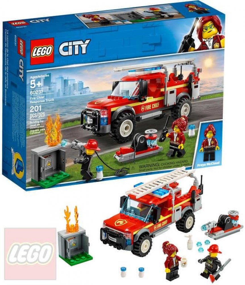 Bezvadná sada LEGO® City 60231 Zásahový vůz velitelky hasičů obsahuje hasičský vůz z kostek s odnímatelným žebříkem, otevírací střechou a displejem v kabině, a navíc také elektrický rozvaděč se sestavitelným prvkem ohně a otevíracími dveřmi, vodní dělo s vodní nádrží a 2 minifigurky.