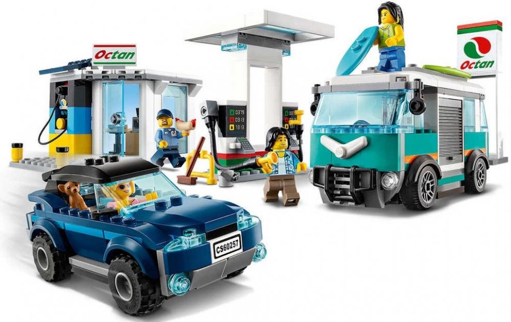 Děti milující modely aut si jistě zamilují tuto sadu LEGO® City Benzínová stanice (60257), která obsahuje čerpací stanici pro vozidla na elektrický pohon a na benzín. Můžete připojit SUV a doplnit Oktan E, načerpat benzín do obytné dodávky u čerpadla a navštívit obchod. A s minifigurkami prodavače, řidiče a 2 surfařů se děti mohou těšit na nekonečné nezávislé hraní.