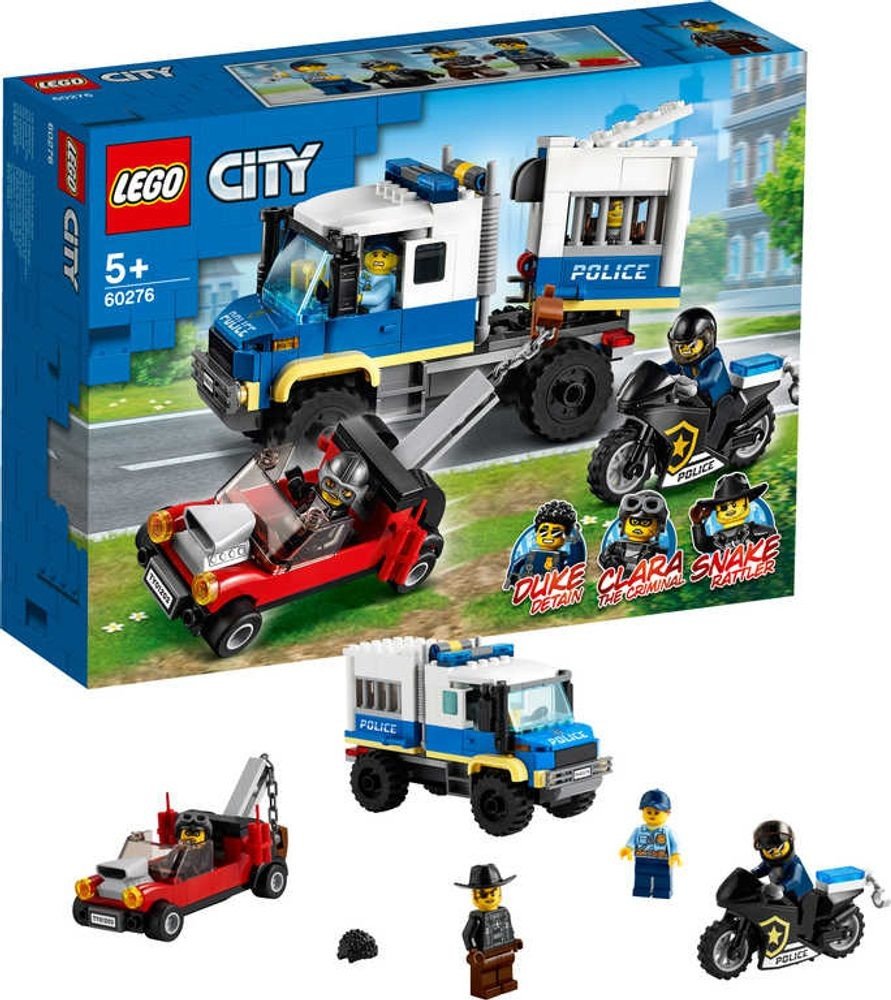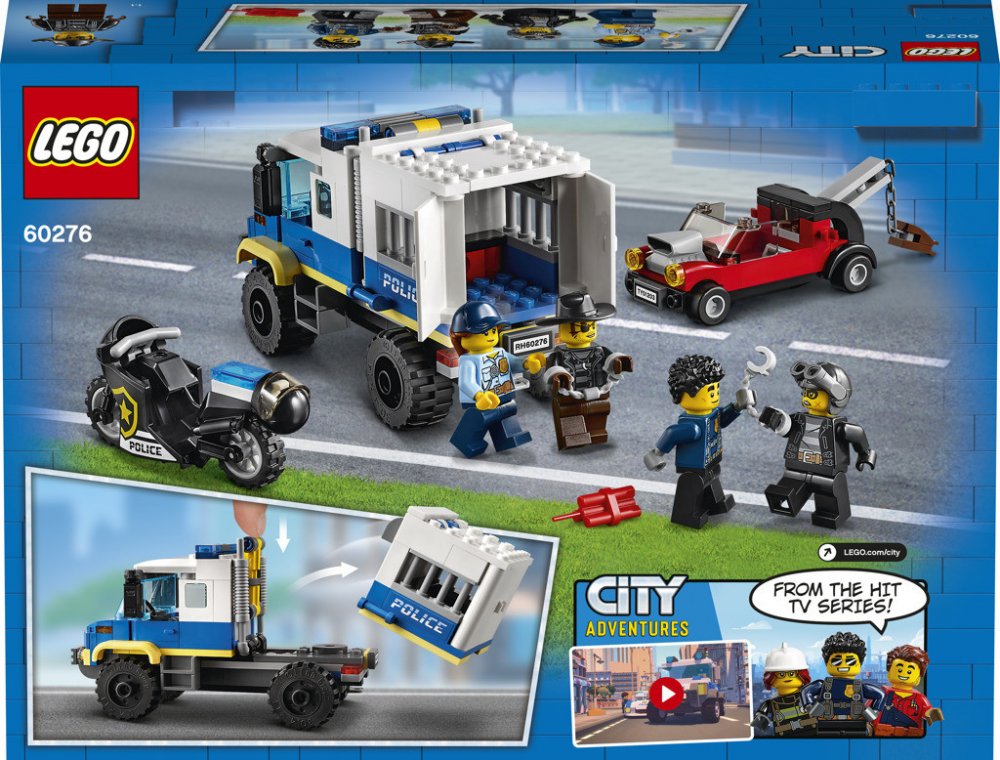 Stavebnice Vězeňský transport (60276) od LEGO® City zaujme postavami z televizního seriálu LEGO City Dobrodružství. Podrobný popis:Stavebnice Vězeňský transport (60276) od LEGO® City zaujme postavami z televizního seriálu LEGO City Dobrodružství. Děti si mohou přehrávat scény a vymýšlet vlastní kreativní příběhy s policejním hrdinou Duke DeTainem a nechvalně proslulými zloději Snake Rattlerem a kriminálnicí Clarou. S vězeňským transportérem s funkcí úniku, vymazleným odtahovým vozem zločinců a Dukeovou parádní černou motorkou je vše připraveno na výbušnou akci. Suprová policejní sada pro děti Součástí této zábavné policejní sady je srozumitelný návod na stavění Instructions PLUS – interaktivní návod s nástroji přibližování a otáčení, které malým LEGO stavitelům pomohou stát se opravdovými mistry. Pokyny Instructions Plus jsou součástí bezplatné aplikace s LEGO návody na stavění pro chytré telefony a tablety. Inspirativní svět LEGO City Policejní sady od LEGO City přinášejí příjemné zážitky ze stavění a hraní. Realistická vozidla, propracované budovy a zábavné postavy podporují kreativní a otevřené hraní pro děti všech věkových kategorií.