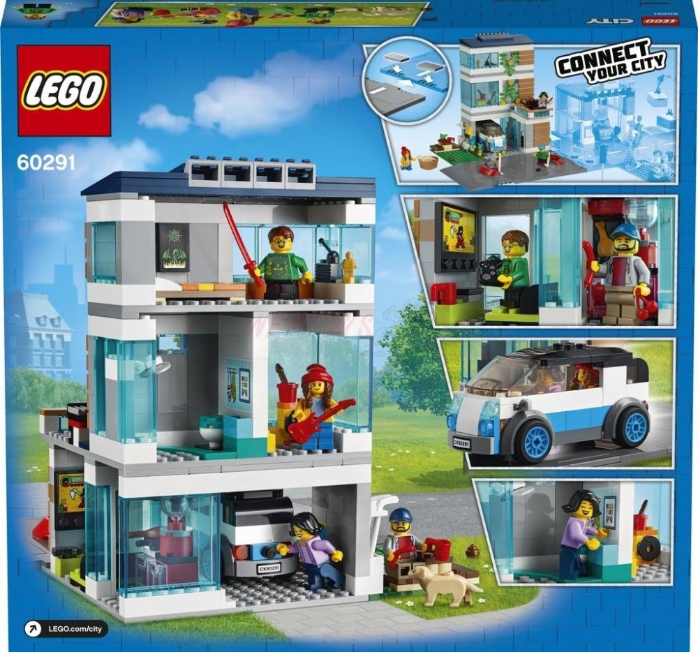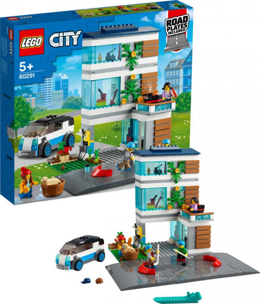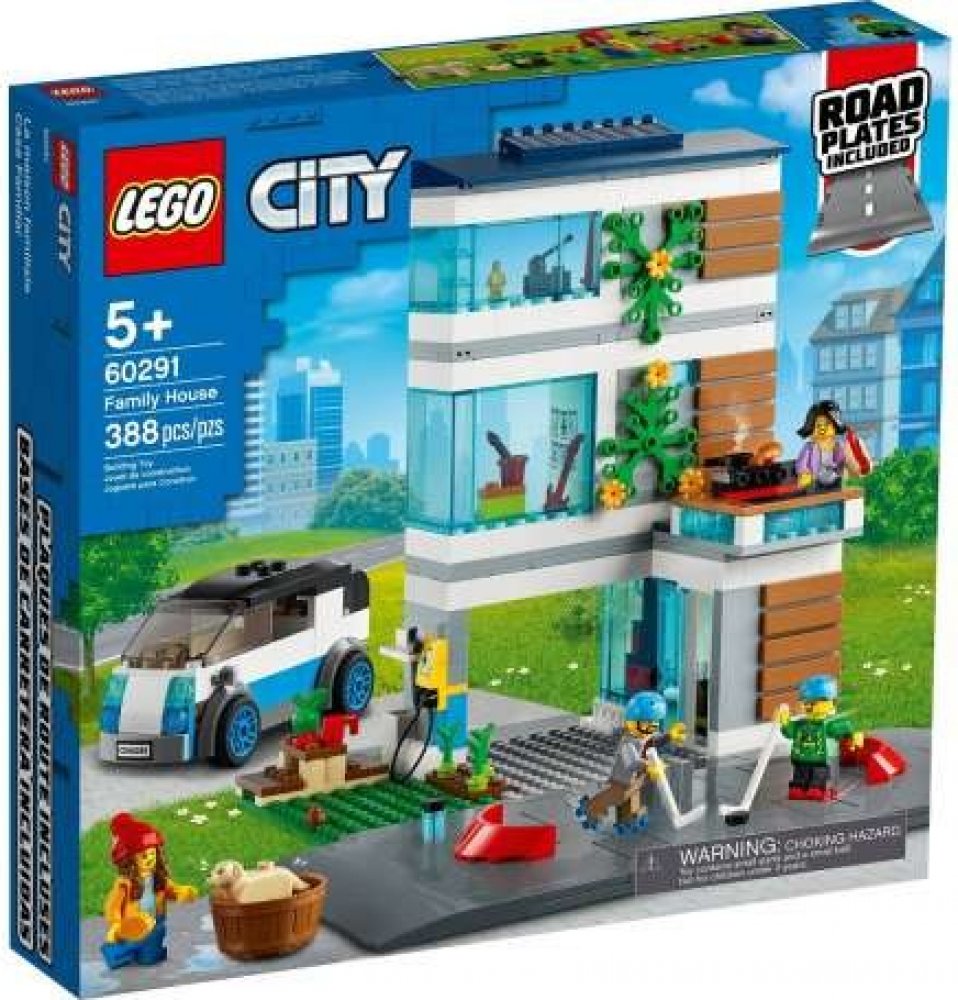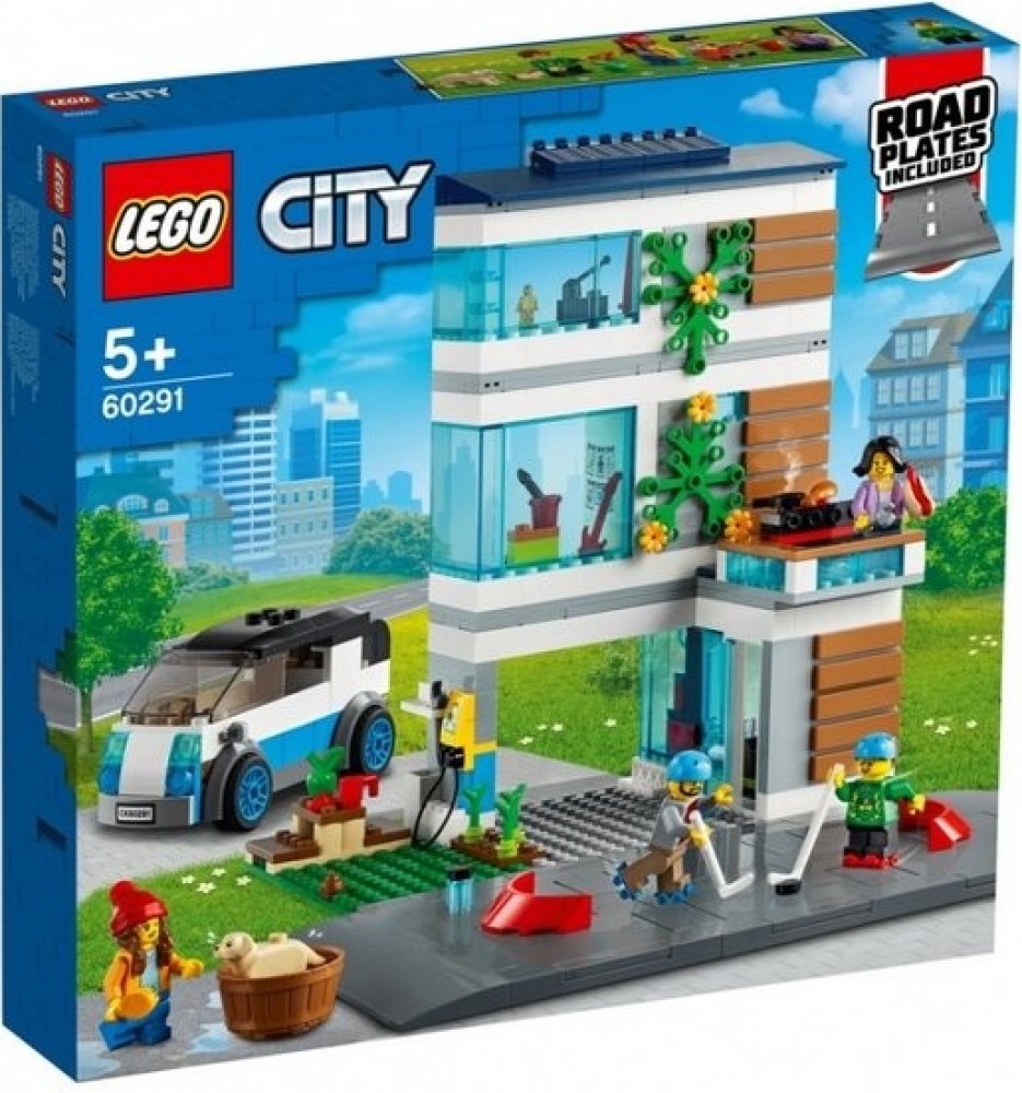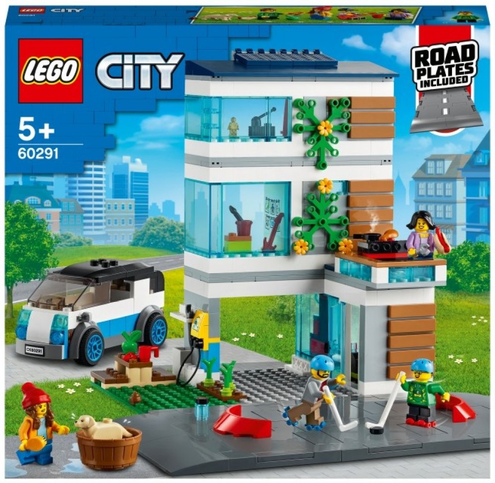 Rodinný dům (60291) od LEGO® City nabízí společenskou místnost, kuchyň, dílnu, ložnici, koupelnu a spoustu ekologických prvků, včetně solárních panelů, nabíjecí stanice a super elektromobilu. Děti mohou tuto sadu rozšířit pomocí křižovatek, a vytvořit si tak vlastní město. Rodina minifigurek, do které patří i figurka labradorského retrívra, zabaví děti na celé hodiny.