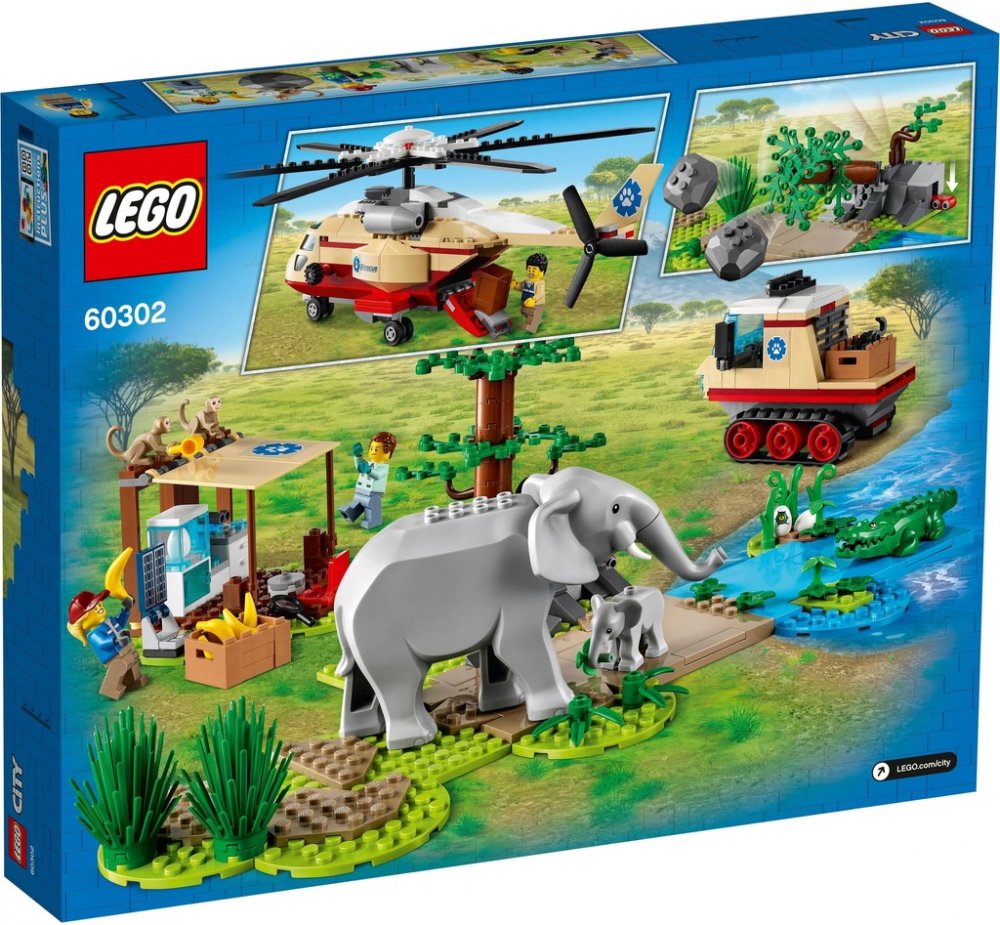 LEGO® City Záchranná operace v divočině se skládá z 525 dílků. Z těchto dílků je možné složit záchranný vrtulník, pásové vozidlo, přírodu savany či veterinární stanici. Dále balení samozřejmě obsahuje figurky slona, mláděte a krokodýla, 2 figurky opic. Jako doplňky pak zvětšovací sklo, banán, dlaha pro opici, hrnek, různé laboratorní pomůcky a krokodýlí vejce.
