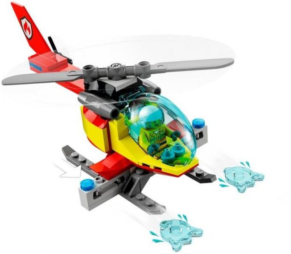Třípatrový model Hasičská stanice od LEGO® City obsahuje řídicí místnost, hasičskou základnu, recepci a garáž, a k tomu navíc vrtulník vystřelující dílky LEGO v podobě vody a hasičský vůz vystřelující vodní šipky.
