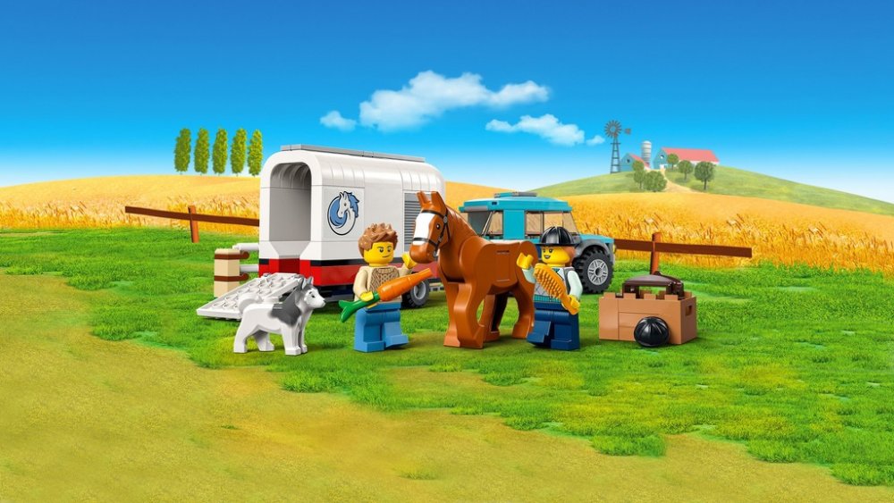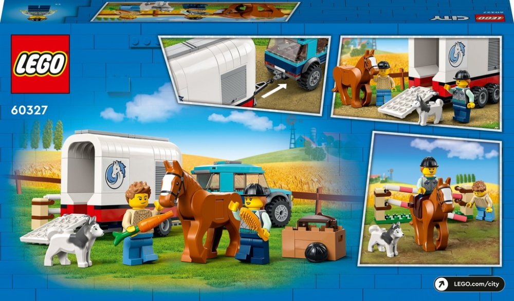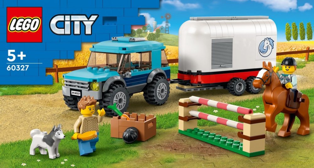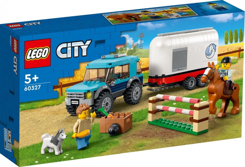 Máme skvělou sadu pro děti od 5 let, které zbožňují koně. Stavebnice Přepravník na koně (60327) od LEGO® City nabízí vše, co děti potřebují pro kreativní dobrodružství, včetně modelu SUV s odnímatelným přívěsem pro koně, výškově nastavitelnou překážkou, 2 minifigurek, figurky koně a figurky psa.