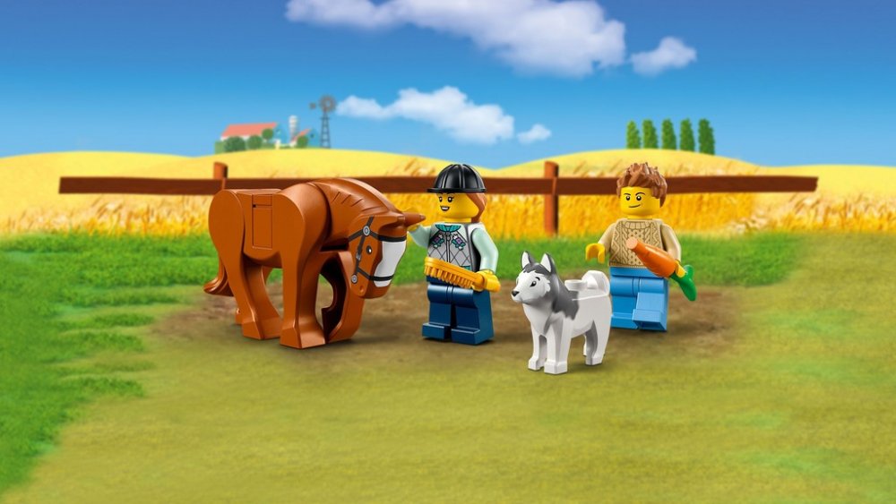 Co se ukrývá v krabici? – Vše, co děti potřebují k sestavení SUV, přívěsu pro koně a skákací překážky, a k tomu navíc 2 minifigurky, figurka koně a figurka psa
