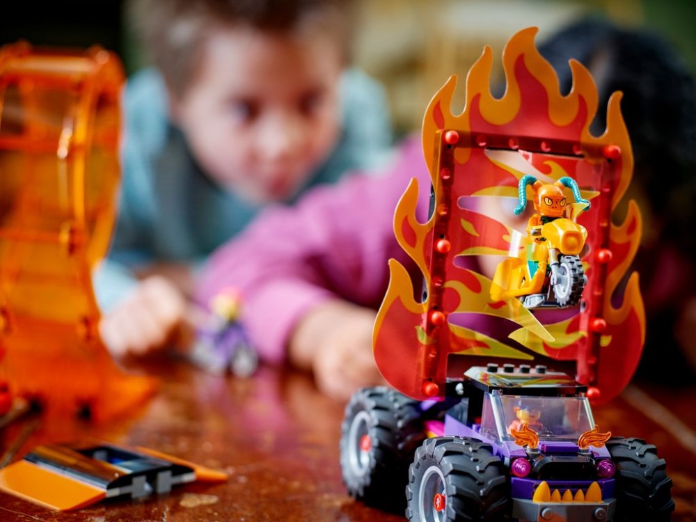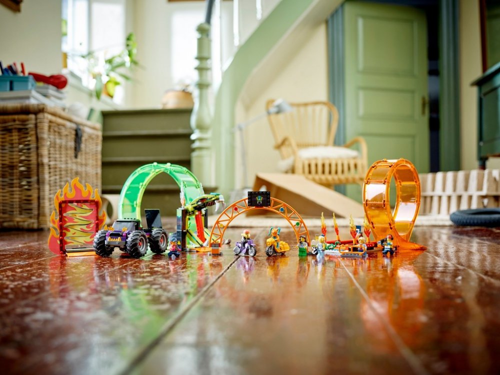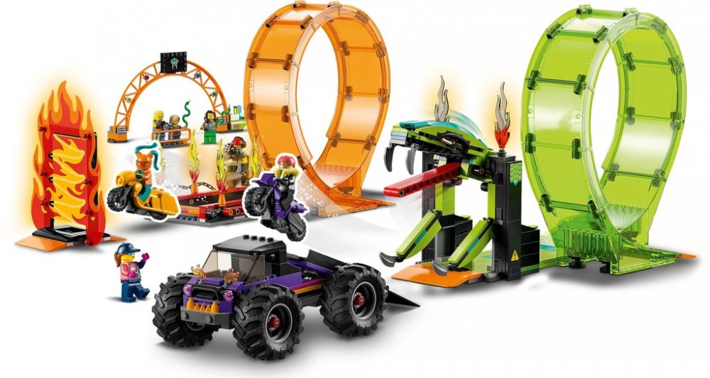 Stavebnice LEGO® City Kaskadérská dvojitá smyčka nabízí řadu zábavných prvků – obsahuje 2 kaskadérské motorky se setrvačníkem a monster truck s rampou pro předvádění skutečných triků.