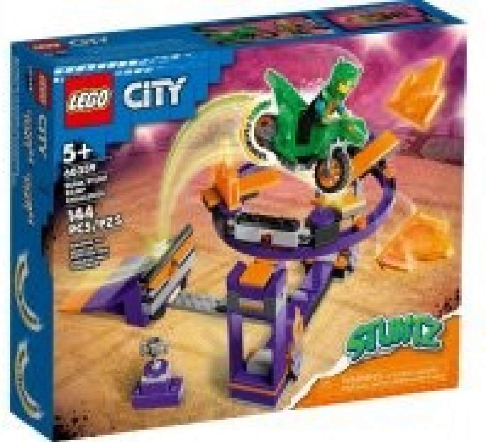 Co vás čeká v krabici? – Tato stavebnice obsahuje LEGO® City Stuntz vodorovně nebo svisle sestavitelnou smyčku, startovací rampu, kaskadérskou motorku se setrvačníkem a minifigurku jezdce