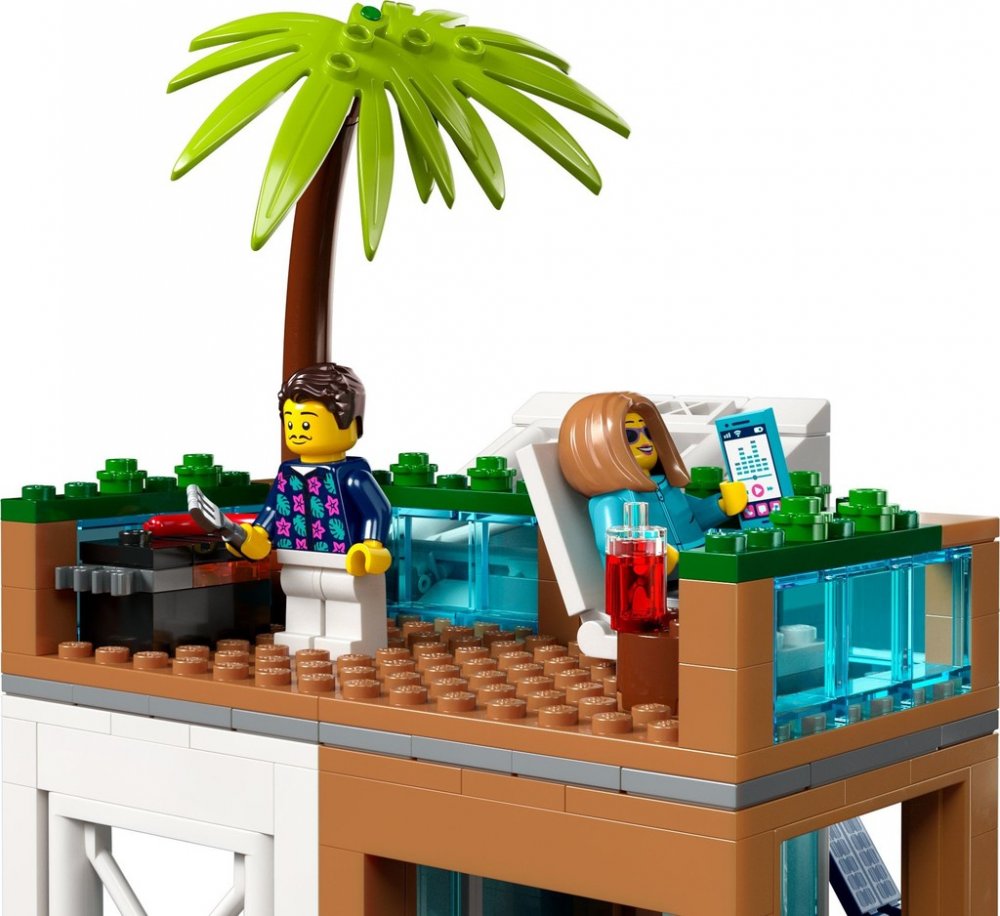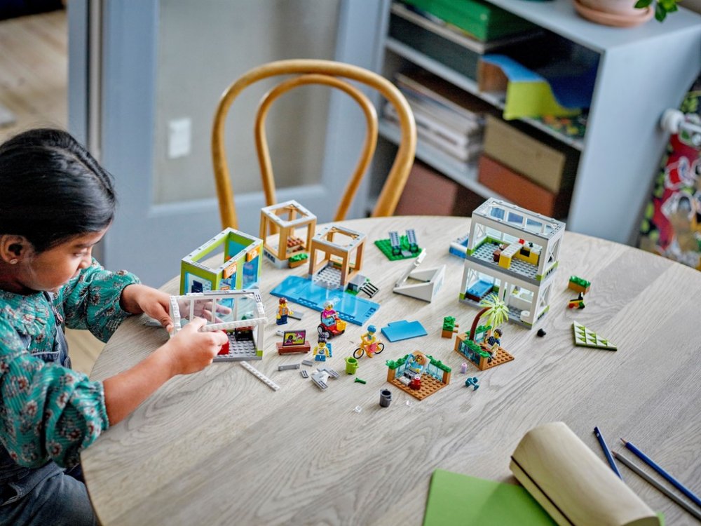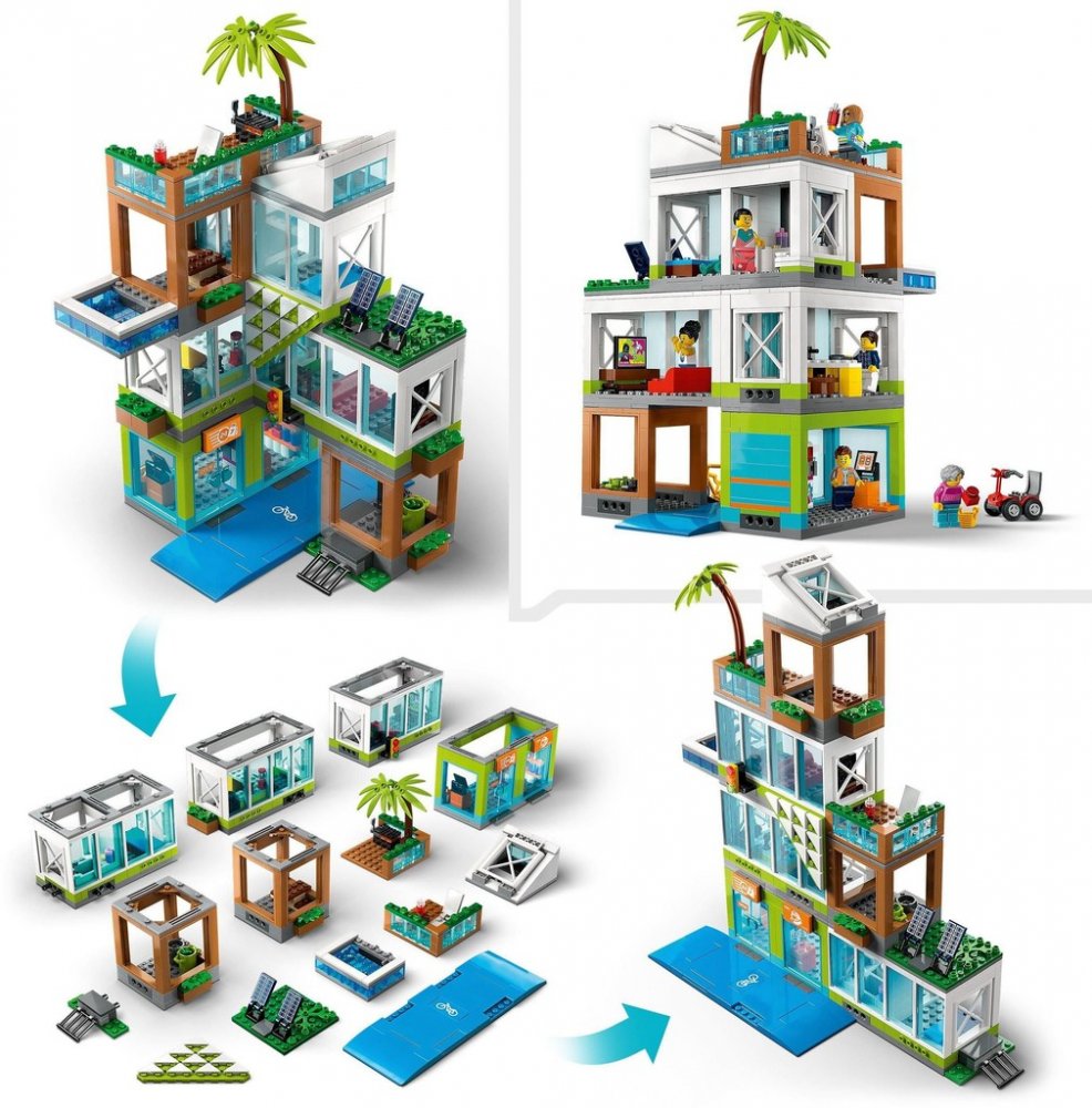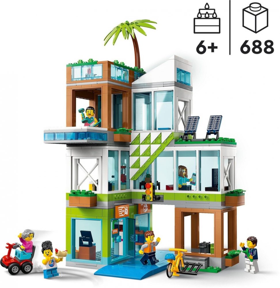 Prémiová stavebnice Bytový komplex pro děti od 6 let nabízí kombinovatelné moduly pokojů s propracovaným interiérem pro nápadité hraní, obchod se smíšeným zbožím, obývací pokoj, kuchyni, ložnici a koupelnu s toaletou a vanou. Sada dále obsahuje elektrický vozík, kolo, 6 minifigurek a LEGO Křižovatku, pomocí níž můžete stavebnici spojovat s dalšími z řady LEGO City.