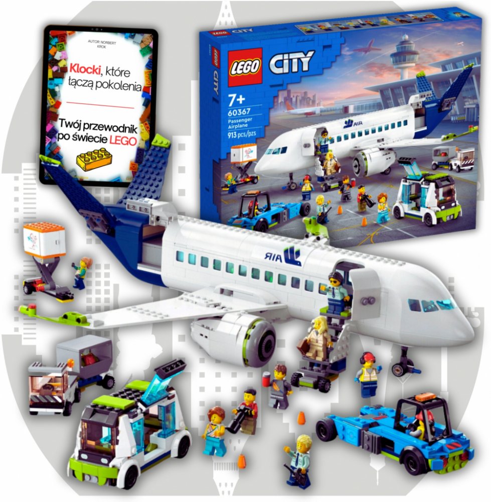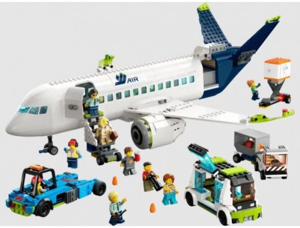 - Co najdete v krabici? – Tato sada obsahuje vše, co děti potřebují k sestavení Osobního letadla, schodů k letadlu, letištního autobusu, tahače letadel, vozu s občerstvením a zavazadlového vozíku, a navíc 9 minifigurek
