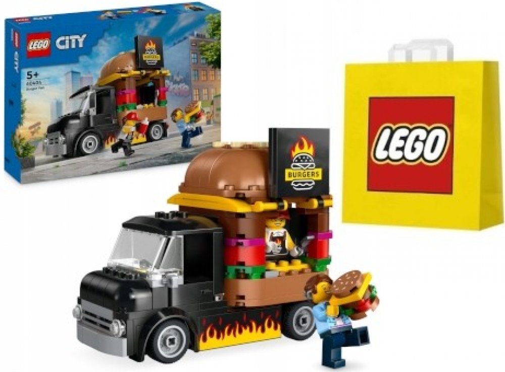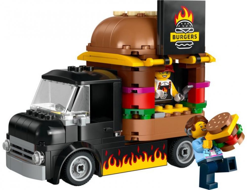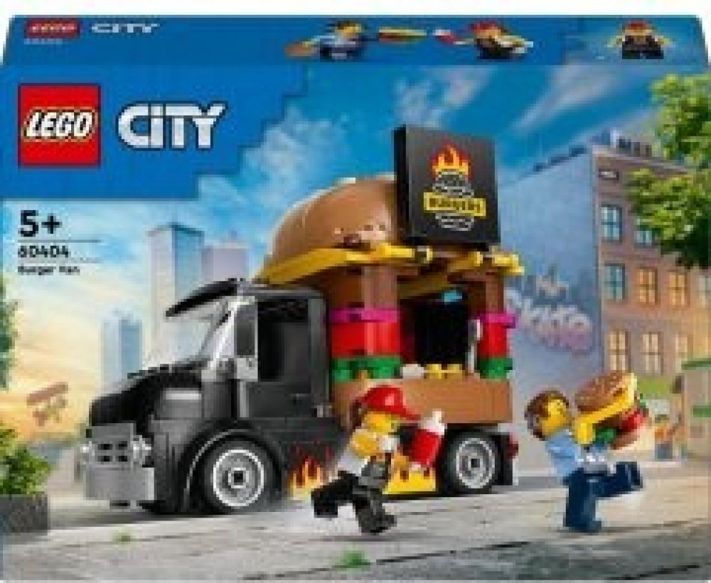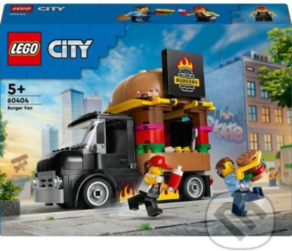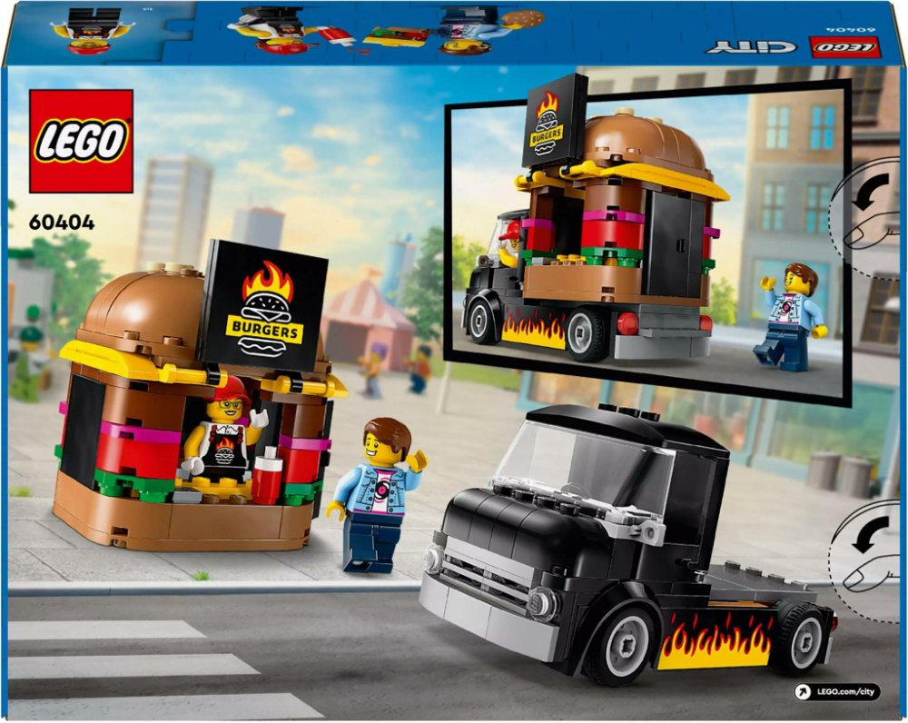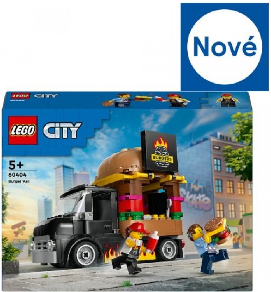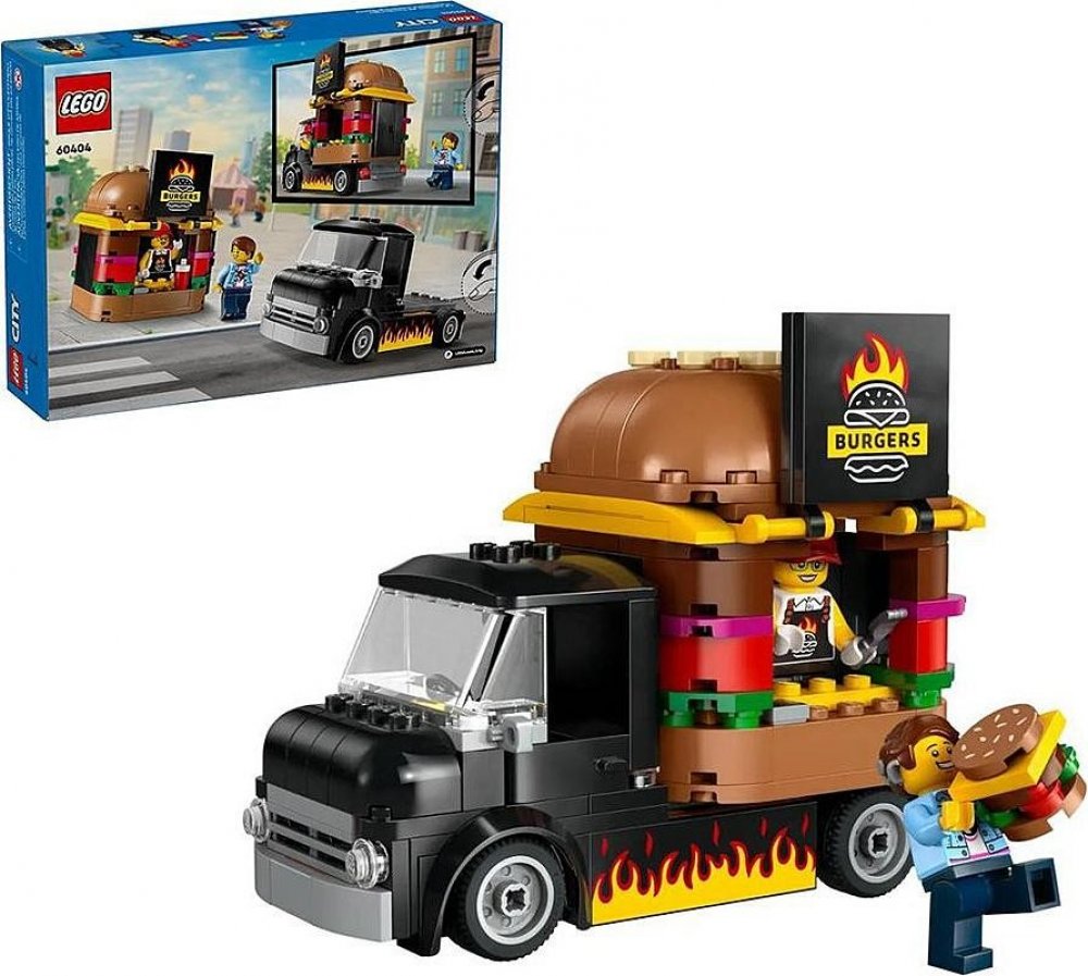Stavebnice LEGO® City (60404) Hamburgerový truck rozproudí fantazii malých stavitelů od 5 let. Střechu pojízdné prodejny hamburgerů zdobí obří burger a propracovaný prostor na přípravu jídla s řadou omáček a dochucovadel lze vyjmout. Zvedněte dvířka a odhalte ceduli s burgerem grilovaným na ohni. Součástí stavebnice je také minifigurka prodejce a zákazníka s kochleárním implantátem.