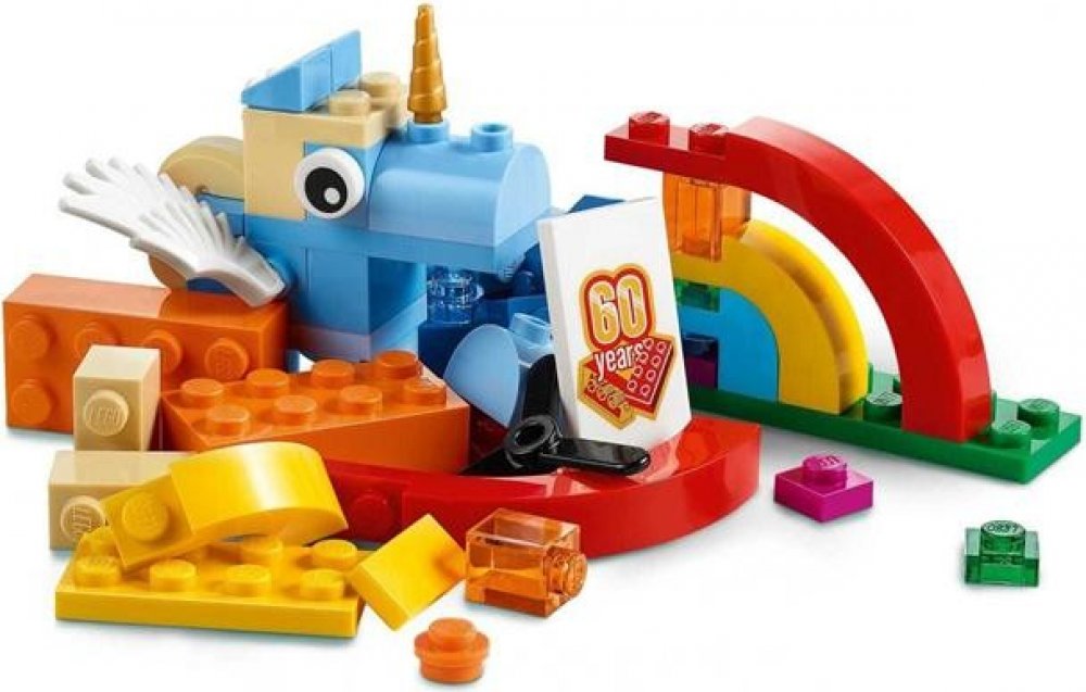 • Obsahuje směs pestrobarevných součástek LEGO®, které se hodí pro kreativní hry s nečekanými vyústěními. Mezi speciálními součástkami této sady jsou kola, různé tvary a kostky s očima a navíc speciální plochá destička na oslavu 60 let kostky LEGO.