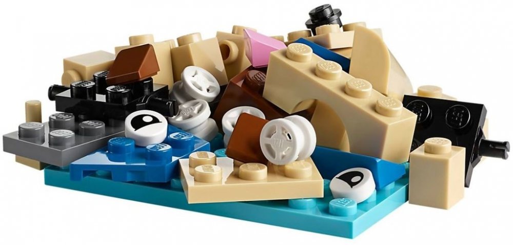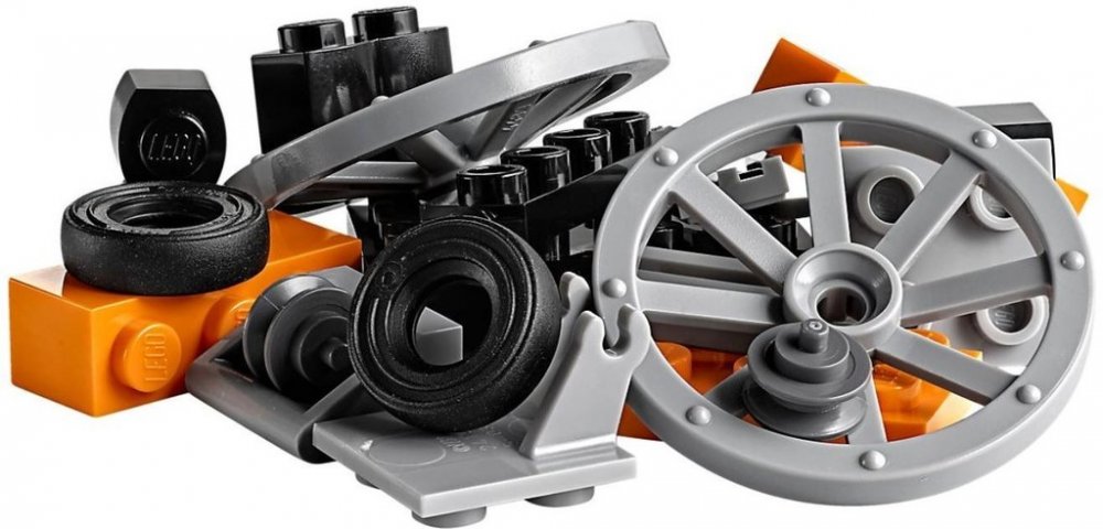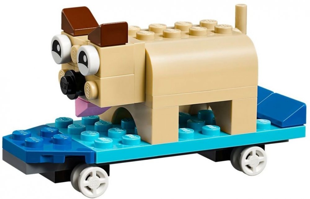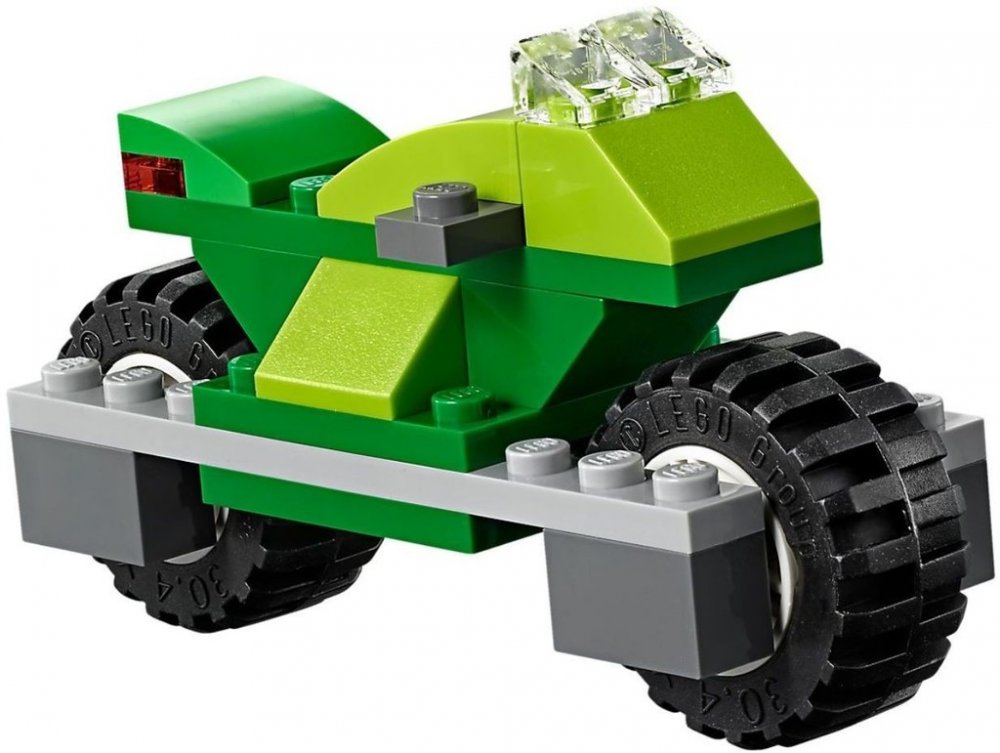 Balení obsahuje širokou škálu koleček a pneumatik v nejrůznějších barvách a velikostech a také výběr pestrobarevných LEGO® kostek, včetně očí a spousty dalších dílků nejrůznějších tvarů.
