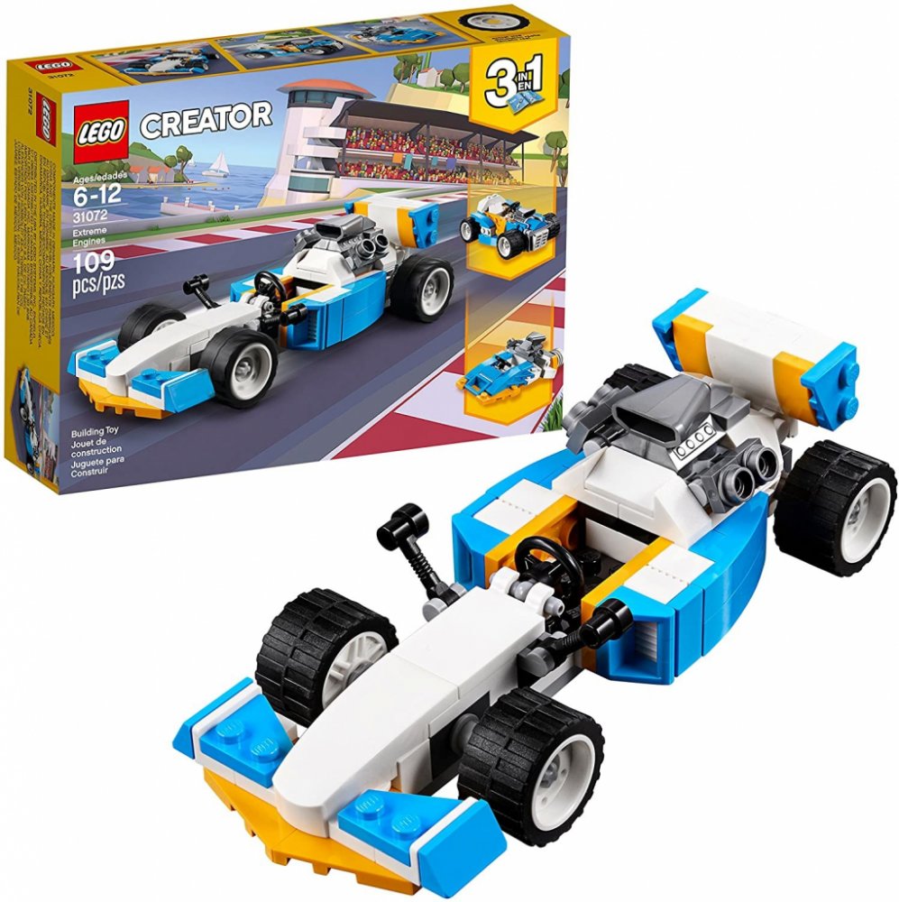 - Sada Extrémní motory 3 v 1 obsahuje přestavitelné závodní auto se spoustou autentických detailů, včetně velkého motoru vzadu, bočních přívodů vzduchu, širokých kol s nízkoprofilovými pneumatikami a nastavitelná zpětná zrcátka a zadní spoiler.