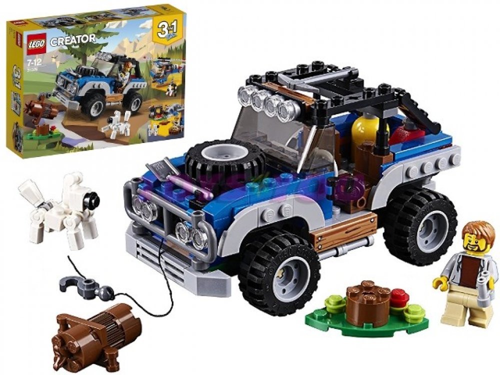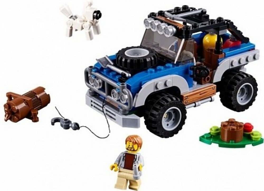 • Obsahuje klasický terénní vůz se střešním prostorem, náhradním kolem připevněným na kapotu, nárazníkem, kabinou pro minifigurky s ochrannou klecí a široké ráfky s mohutnými pneumatikami, navíc s funkčním navijákem, sestavitelným stromem a zelení.