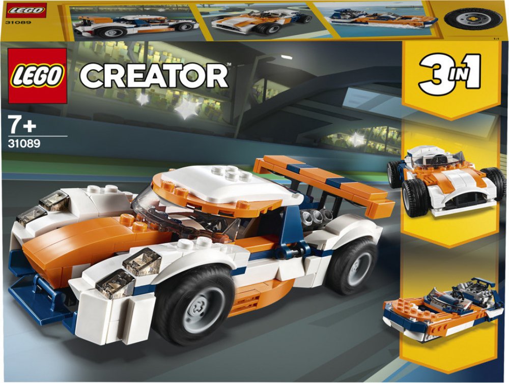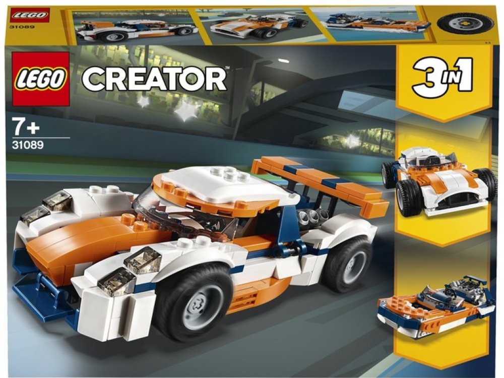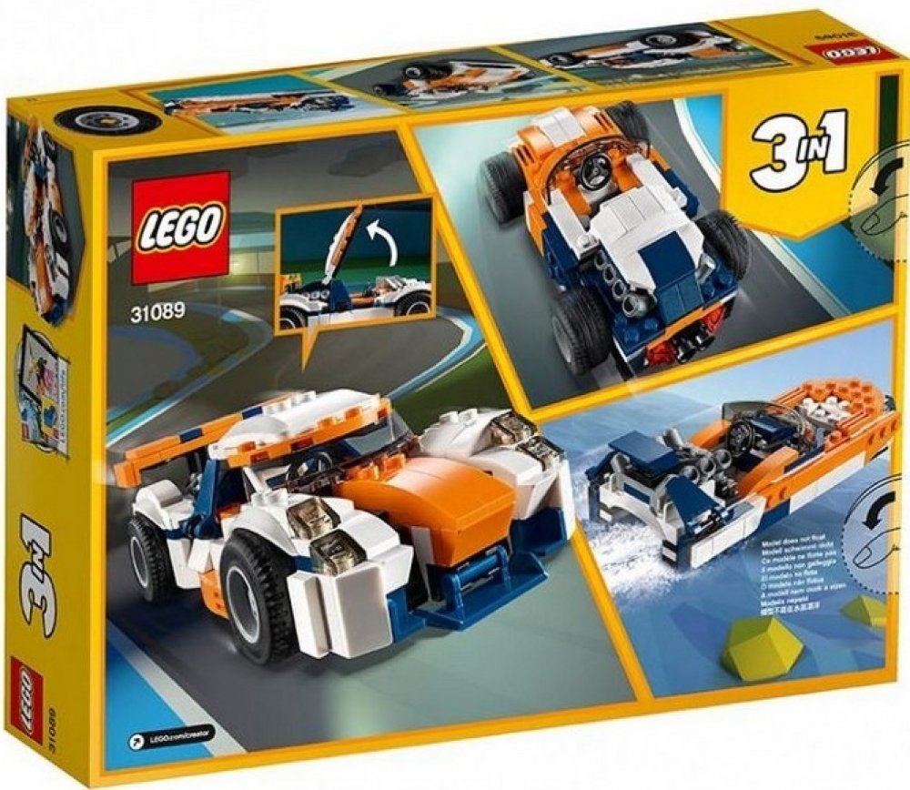 - Vychutnej si 3 stavební příležitosti s touto sadou LEGO® Creator 3 v 1. Postav závodní model Sunset a přestav ho na klasické závodní auto s otevřenou střechou nebo na výkonný LEGO motorový člun a vychutnej si akci s rychlými motory.