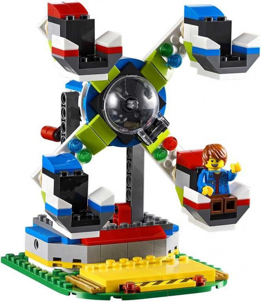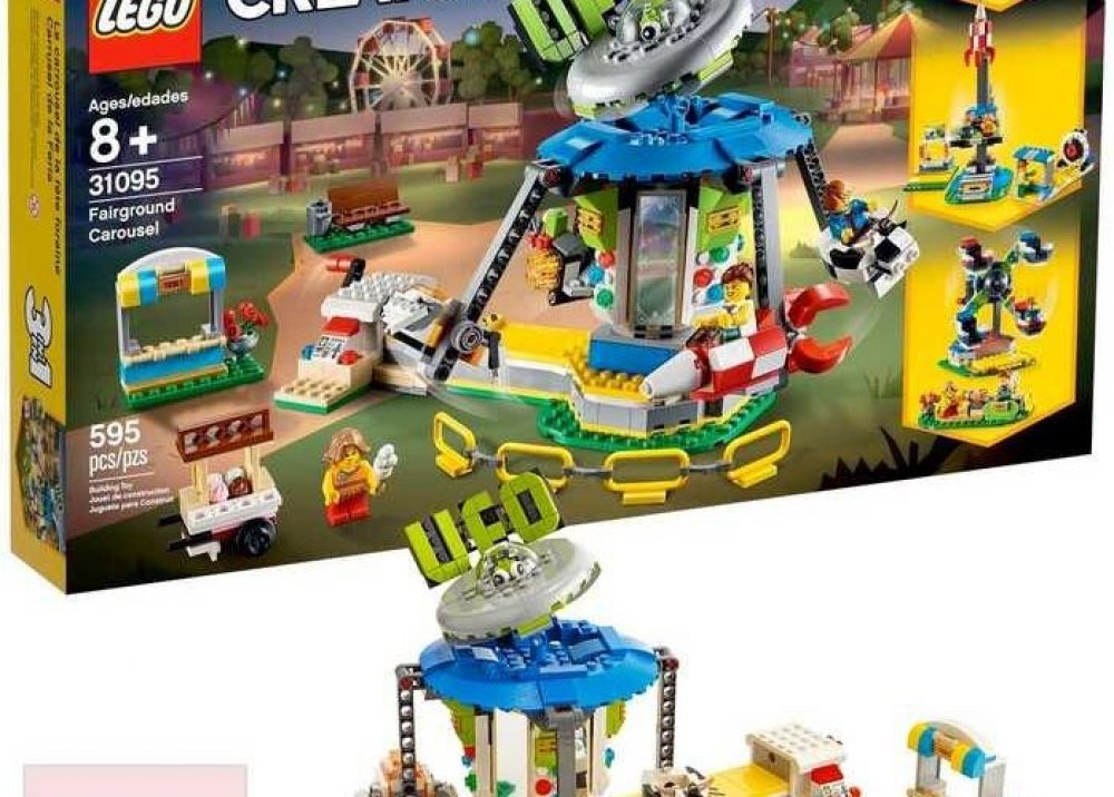 - LEGO kolotoč nabízí vesmírný kolotoč s UFO cedulí a 4 vozíky, které mají tvar rakety, raketoplánu, vesmírné lodi a strakaté krávy.