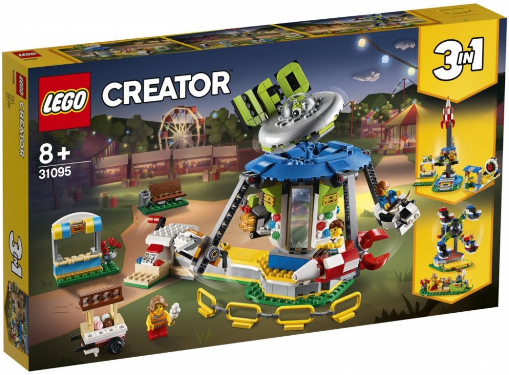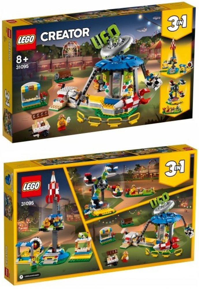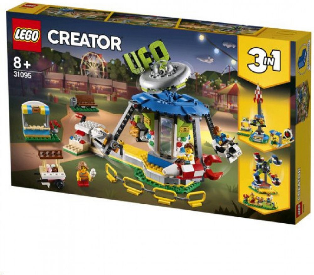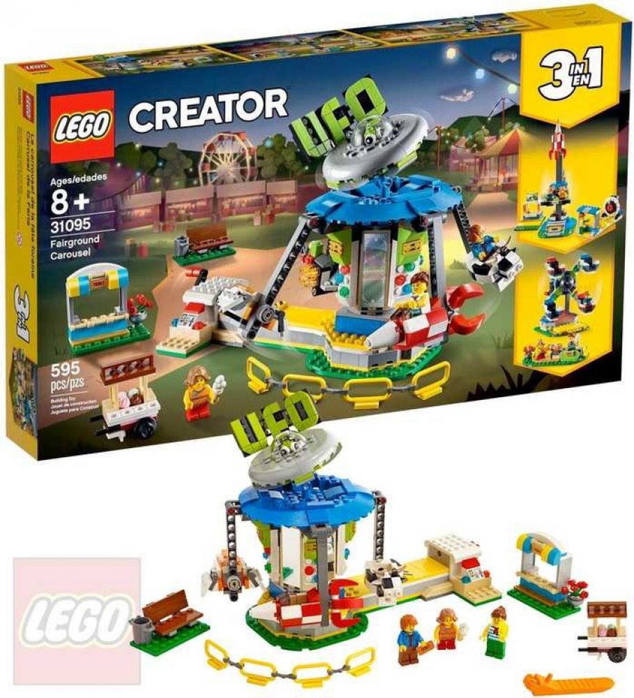 Postav si svět kouzelného dobrodružství se sadou LEGO® Creator 3 v 1 31095 Pouťový kolotoč, která nabízí vesmírný kolotoč s UFO cedulí, stánek se vstupenkami, zmrzlinářský vozík a parkovou lavičku. Děti nasednou do jednoho ze čtyř vozíků - rakety, raketoplánu, mimozemské lodi nebo legrační strakaté krávy - a pak kolotoč roztočí pomocí červené rukojeti. V této stavebnici děti najdou 3 různé modely, se kterými si užijí hodiny hraní a zábavy. Kolotoč lze přestavět na věž s volným pádem nebo ruské kolo. Součástí sady jsou 3 minifigurky, které jsou připravené na spoustu pouťové zábavy.