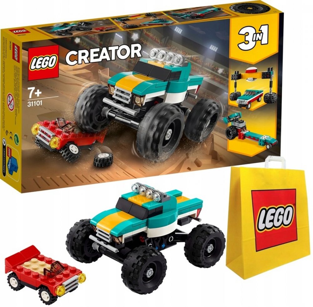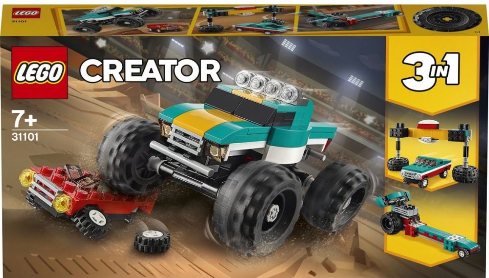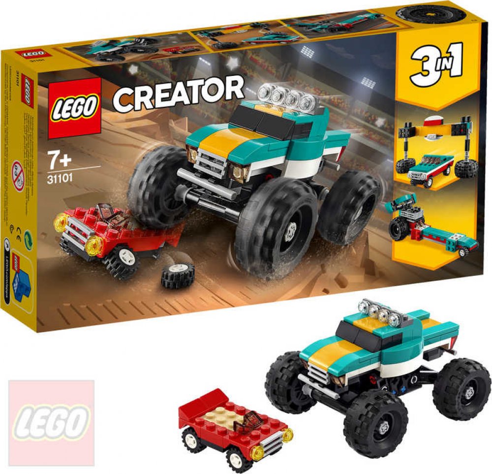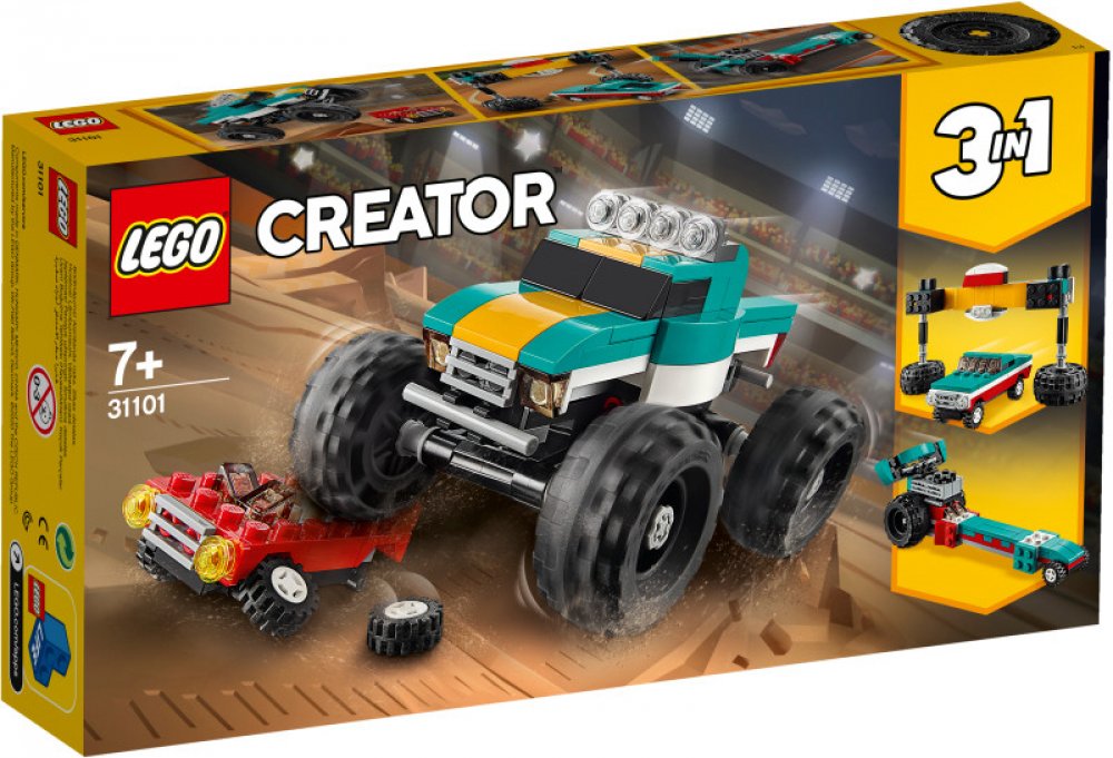 - Stavebnice Monster truck (31101) od LEGO® Creator 3 v 1 dětem nabízí 3 stavitelské možnosti: ohromný monster truck, výkonný sporťák a super rychlý dragster. Se stavebnicí je možné si hrát samostatně nebo modely spojit a kombinovat s dalšími LEGO® sadami pro ještě množství stavitelských možností.