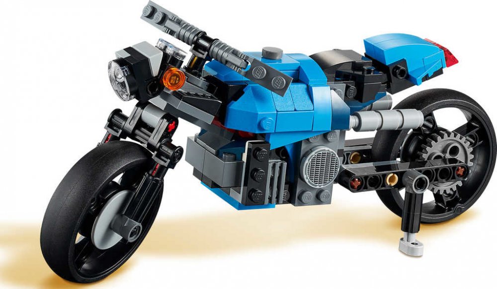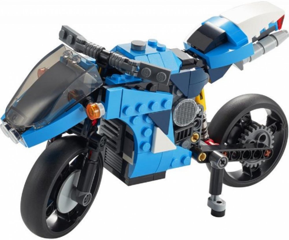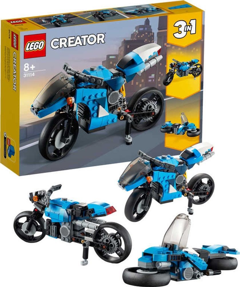 - Stavebnice Supermotorka (31114) od LEGO® Creator 3 v 1 nabádá ke kreativnímu stavění bez konce a nabízí hned 3 modely v 1 sadě - sportovní motorku, klasickou mašinu a vznášející se motorku z budoucnosti.