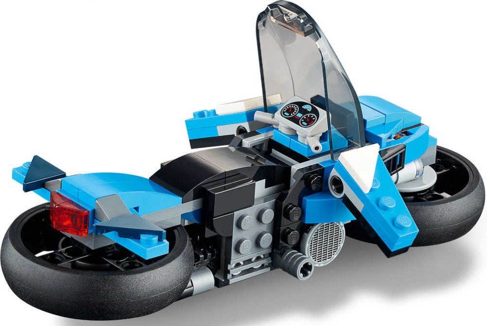 Tato sada od LEGO Creator 3 v 1 dětem umožní vychutnat si 3 různé stavitelské zážitky. Mohou vytvořit moderní supermotorku, následně ji předělat na klasický motocykl se stojánkem, poté se vznést do vzduchu na futuristické létající motorce nebo zapojit fantazii a vymyslet něco zcela nového.