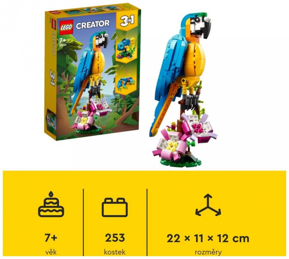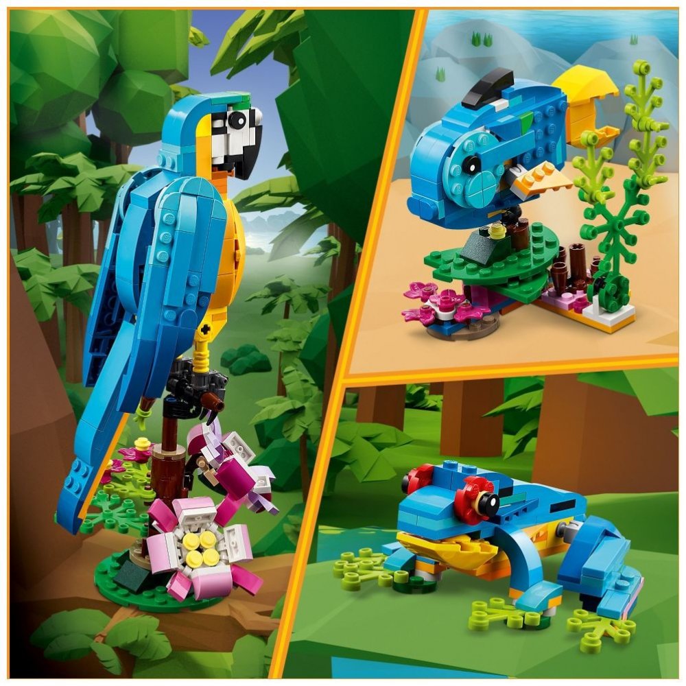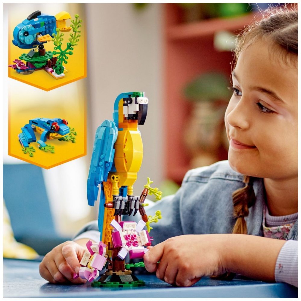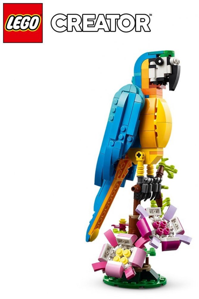 Se stavebnicí Exotický papoušek se malí stavitelé a milovníci zvířat od 7 let vypraví do pralesa, kde zažijí akční dobrodružství. Mohou se těšit na pestrobarevného papouška, který sedí na větvi, kde se otáčí a hýbe křídly a ocasem. S touto stavebnicí LEGO 3 v 1 budou mít děti příležitost postavit si 3 různá exotická zvířata. Mohou si poskládat barevného papouška na větvi stromu a přestavět ho na hravou rybu plavající v moři nebo na zábavnou žábu, která umí hýbat nohama. Stáhněte si aplikaci s návody LEGO Builder, která dětem umožní vychutnat si zcela novou porci zábavy při stavění díky funkcím přibližování a otáčení modelů ve 3D, ukládání stavebnic a sledování postupu.