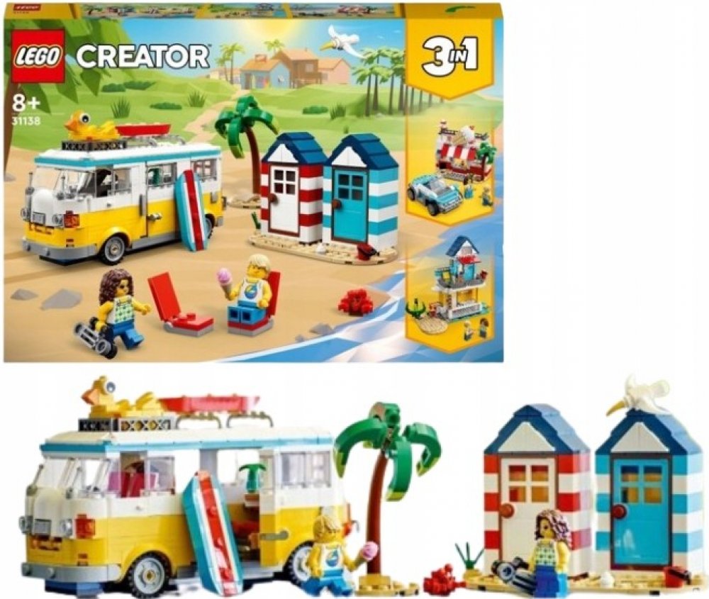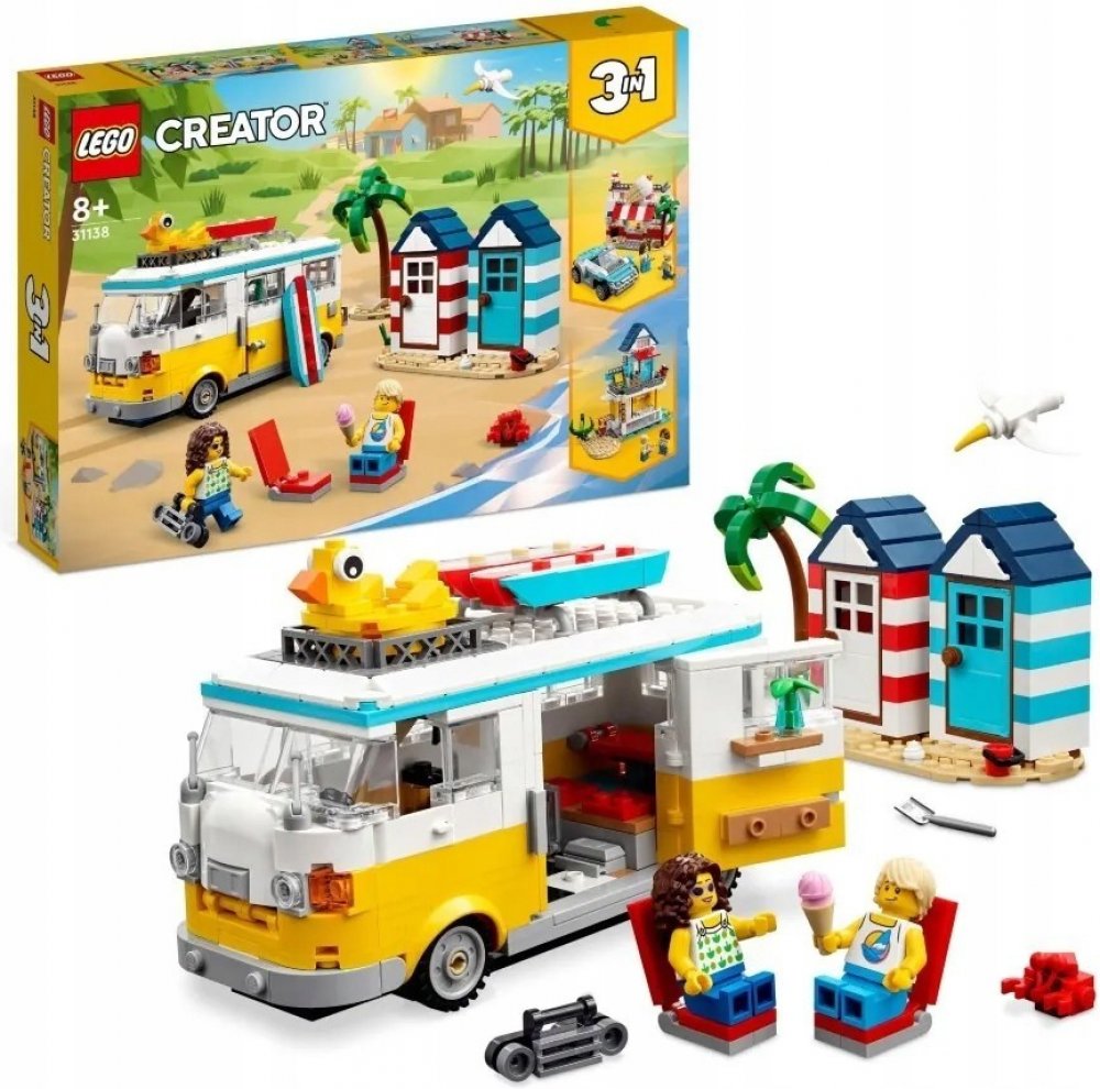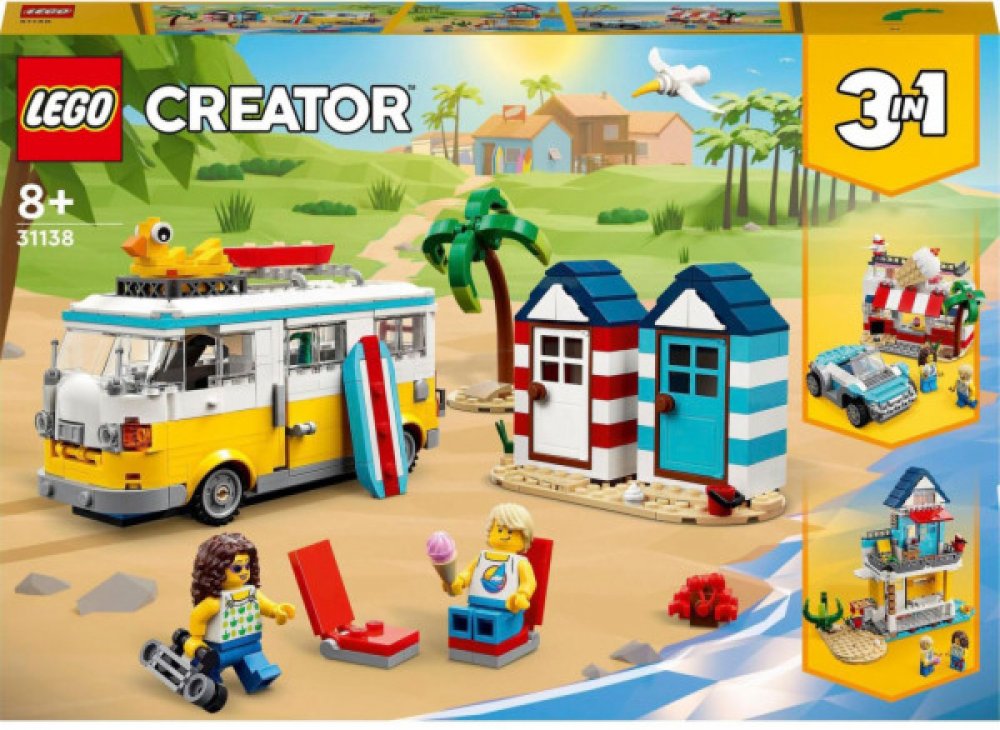 Obytný vůz na pláži Děti ve věku od osmi let budou hrátć plážové scény baví LEGO® Creator 3-v-1 Beach Camper (31138). Součástí je obtní vůz s kuchyňkouą a spálni jsou odnímatelnou střechou, otevírací stranou a 2 minifigurkami. Celý komplementární Pozoruje dvě plážové chatky, palmu, blokovou surfovou prkno, dvě lehátka a albatrosa. Kreativní hračka 3 v 1 S touto sadou 3 v 1 mohou fanoušci LEGO... v...