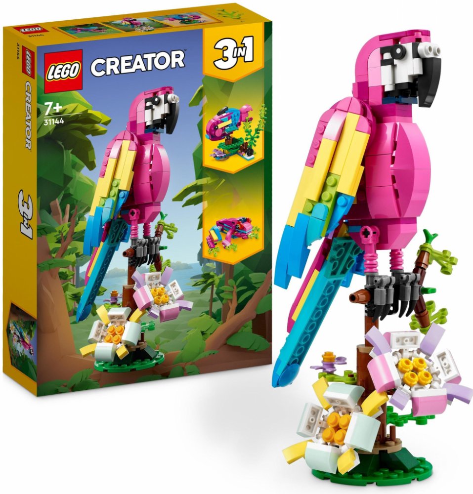 3 modely exotických zvířat v 1 stavebnici – Se stavebnicí LEGO® Creator 3 v 1 (31144) Exotický růžový papoušek se děti od 7 let vydají do pralesa a setkají se s papouškem, rybou a žábou