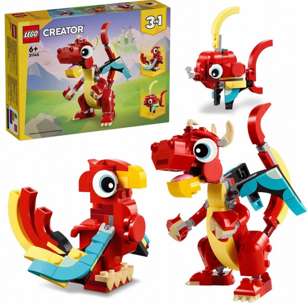 Stavebnice LEGO® Creator 3 v 1 31145 Červený drak přináší neomezené možnosti zábavy díky třem různým modelům v jednom balení. Z těchto stejných kostek si děti kromě draka postaví i nádherného fénixe s pestrobarevnými křídly nebo roztomilou rybku. Každý model je navržen tak, aby byl pohyblivý a poskytl autentický herní zážitek. Možnost přestavby umožňuje dětem neustále objevovat nové způsoby hry a vytvářet vlastní jedinečná zvířátka. S touto LEGO® stavebnicí si mohou malí tvůrci vyzkoušet různé stavitelské techniky a rozvíjet svou kreativitu při stavění jedinečných tvorů.