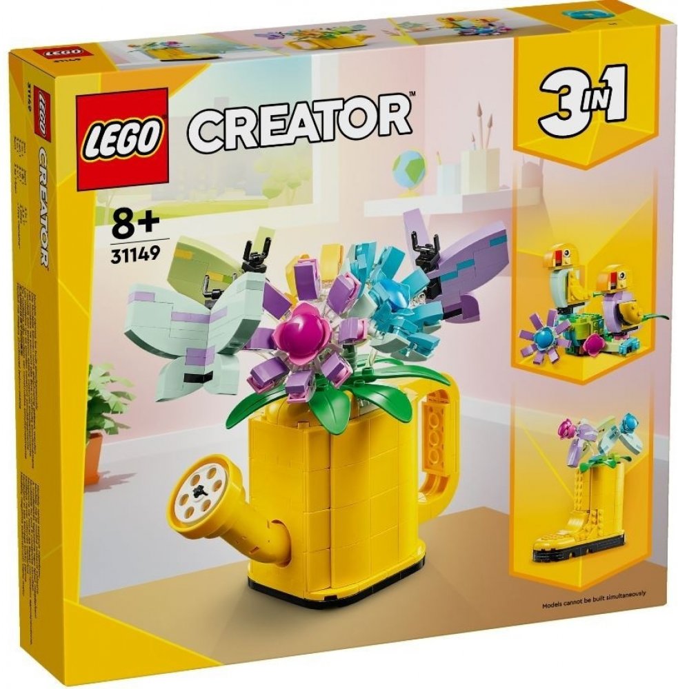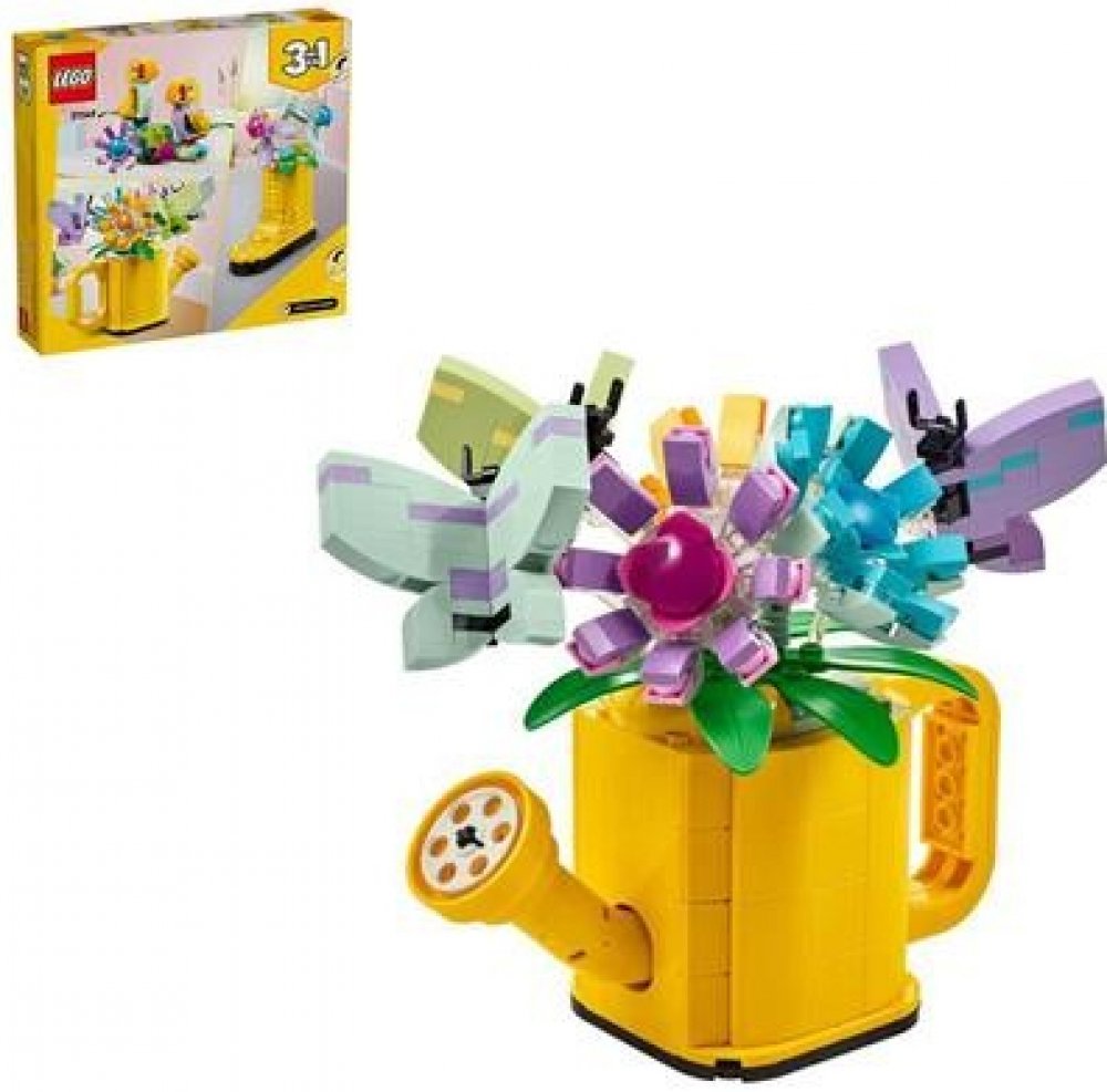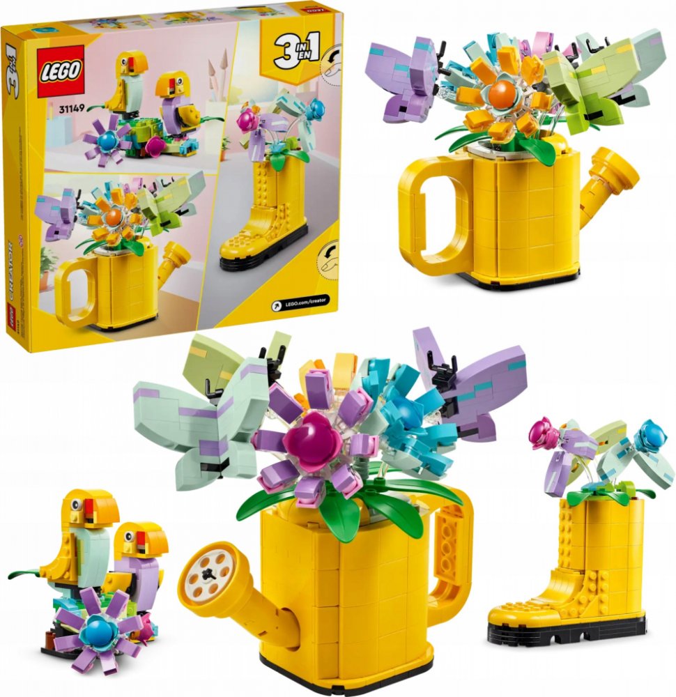 Postav, přestav, hraj si a vystav tři barevné modely inspirované přírodou ze sady 3v1 LEGO® Creator Květiny v konvičce. Obsahuje žlutou zděnou konev s madlem a výlevkou. Po hraní můžete modely vystavit na polici.