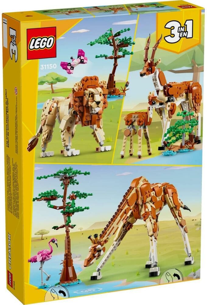 Děti od 9 let se se stavebnicí Divoká zvířata ze safari budou cítit jako mezi skutečnými zvířaty. Užijí si nápadité hraní s modely zvířat, včetně žirafy s pohyblivýma nohama, dlouhým krkem, ocasem a ušima, která se tyčívedle modelu stromu a plameňáka. Jakmile herní dobrodružství skončí, děti si mohou všechny 3 modely vystavit. ato stavebnice LEGO dětem přináší svět nekonečných herních možností. Ze stejné sady kostek si postaví hned 3 různá zvířata: Pohyblivou žirafu se stromem a plameňákem, kterou pak přestaví na 2 pohyblivé modely gazel – dospělou gazelu s mládětem – se 2 keři nebo model přeskládají na lva se stromem a motýlem.