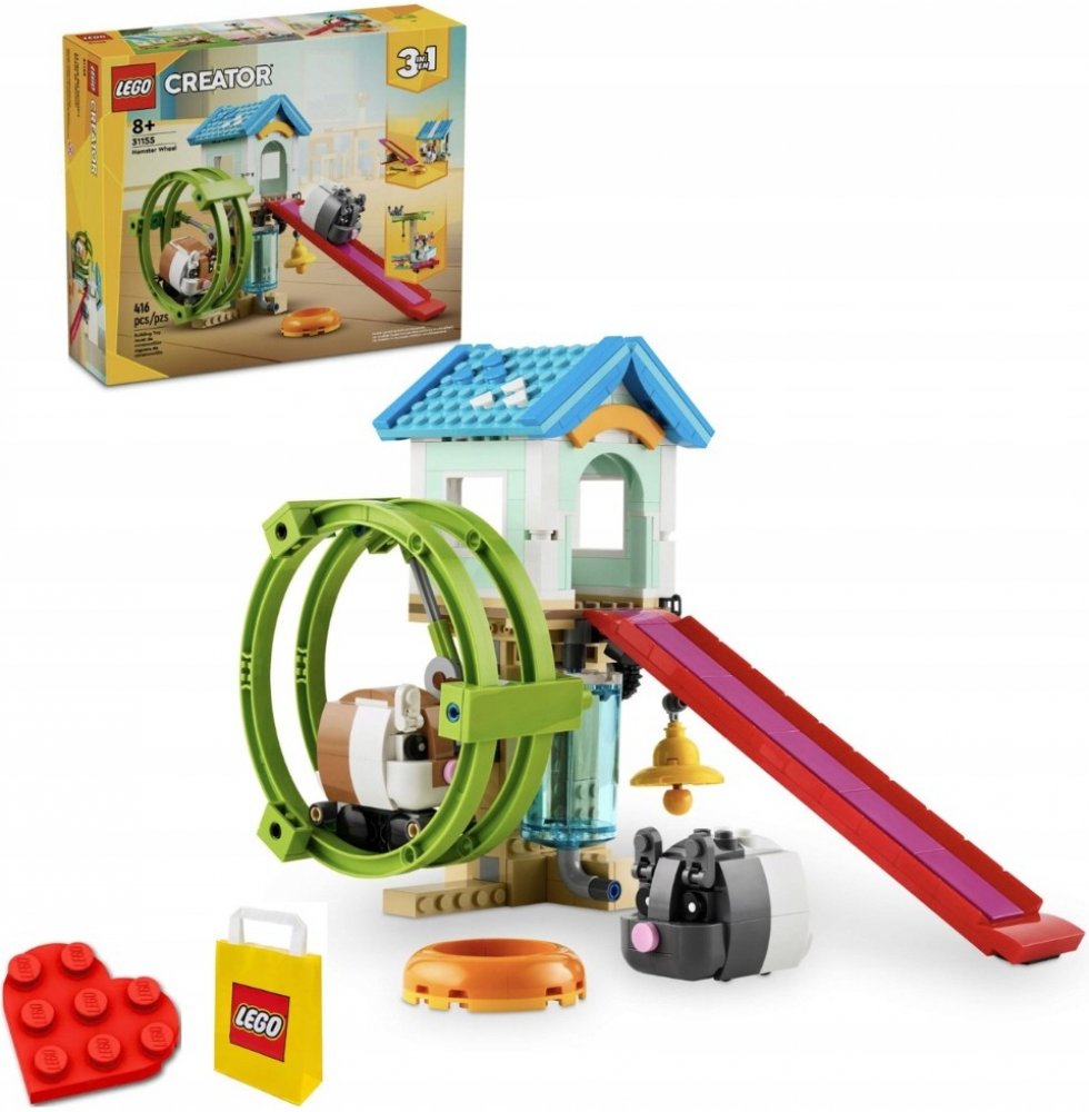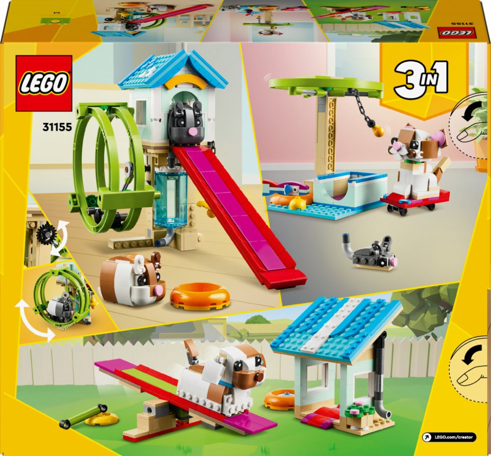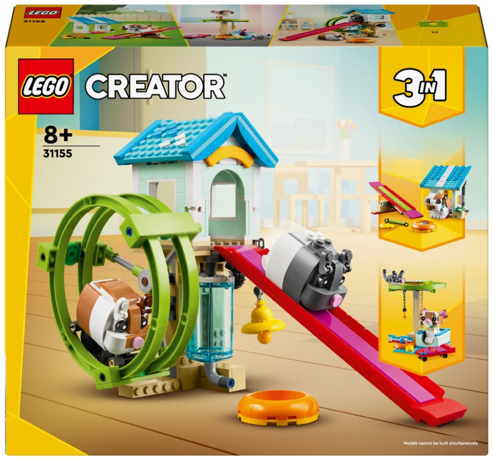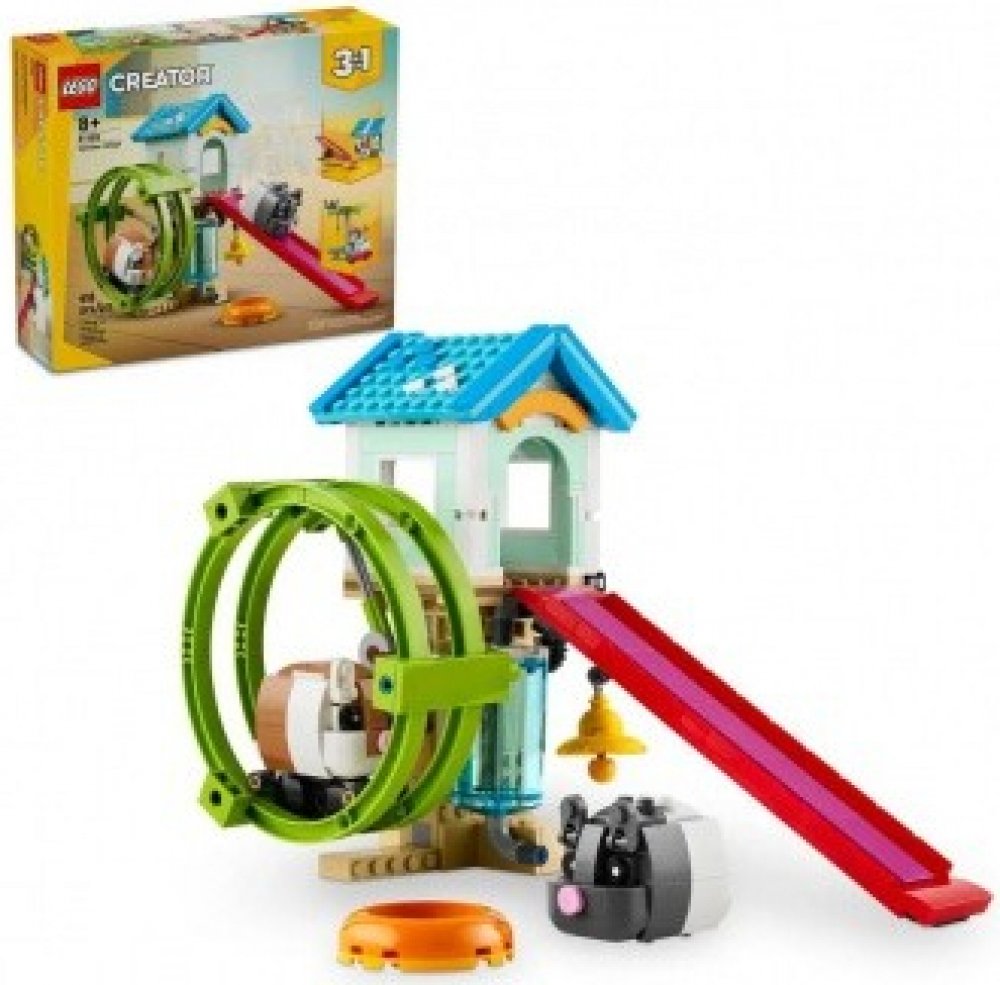 Milovníci domácích mazlíčků si se stavebnici LEGO® Creator 3 v 1 Kolotoč pro křečka užijí spoustu zábavy a pak ji přestaví na kočičí hrací koutek nebo na psí boudu. - Se stavebnicemi LEGO® 3 v 1 si děti od 8 let postaví 3 různé hračky zvířat - Děti mohou stavět, přestavovat a přehrávat si příběhy se 3 různými modely zvířat - Každý ze 3 malých modelů zvířat má pohyblivé nebo interaktivní funkce - Jakmile si děti dohrají, každou ze stavebnic si mohou vystavit na polici nebo na nočním stolku - Tato hračka 3 v 1 představuje skvělý narozeninový nebo vánoční dárek pro tvořivé děti - Prohlédněte si i další stavebnice z řady LEGO® Creator 3 v 1 (prodávají se samostatně) - Postavte si zvířata, vozidla a městské scény se stavebnicemi LEGO® Creator 3 v 1 - Tato stavebnice 3 v 1 se skládá ze 416 dílků a model domečku pro křečka měří přes 19 cm na výšku Děti od 8 let a milovníci zvířat si s rozkošnou stavebnicí 3 v 1 Kolotoč pro křečka (31155) užijí spoustu zábavy. Součástí je interaktivní domeček na hraní s kolečkem, ve kterém si jeden z křečků zaběhá, a skluzavkou, z níž se sklouzne druhý křeček. Nechybí řada zábavných doplňků, jako je napáječka na vodu, pneumatika, visící zvonek a miska na krmivo. Stavebnice LEGO® Creator 3 v 1 dětem umožňují z jedné sady stejných kostek postavit hned 3 různé malé modely zvířat. Postaví si domek pro křečka, který pak přestaví na kočičí hrací koutek s kolotočem a skateboardem nebo na psí boudu s rampou, po které se pejsek sklouzne ke skvělým hračkám, se kterými si bude hrát. Stavebnice Creator 3 v 1 představují skvělé dárky LEGO pro děti. Malí stavitelé v každé krabici najdou dílky k sestavení a přestavování 3 různých modelů. Se stavebnicemi 3 v 1 je čekají hodiny zábavy a postaví si s nimi modely inspirované jejich zájmy, včetně superrychlých vozidel, úžasných zvířat a propracovaných městských scén.