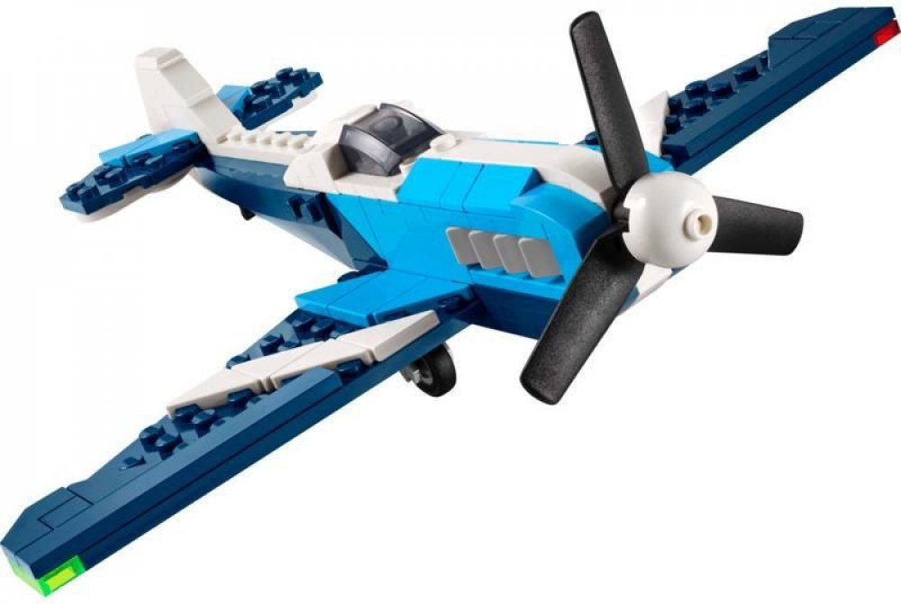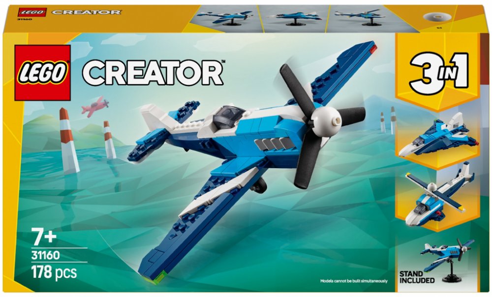 Na kluky a holky od 7 let se stavebnicí LEGO Creator 3 v 1 Závodní letadlo čekají superrychlá dobrodružství. Model letadla má vpředu otočnou vrtuli, pohyblivá kola, aby se mohlo pohybovat po zemi, a podstavec z kostek na vystavení. Děti si postaví 3 úžasná vozidla: model letadla s otáčející se vrtulí a pohyblivými koly, tryskáč s pohyblivými koly a helikoptéru s listovým rotorem. Každý model lze vystavit na stojanu z kostek. Stavebnice představuje působivý dárek pro děti, které mají rády nápadité akční příběhy.
