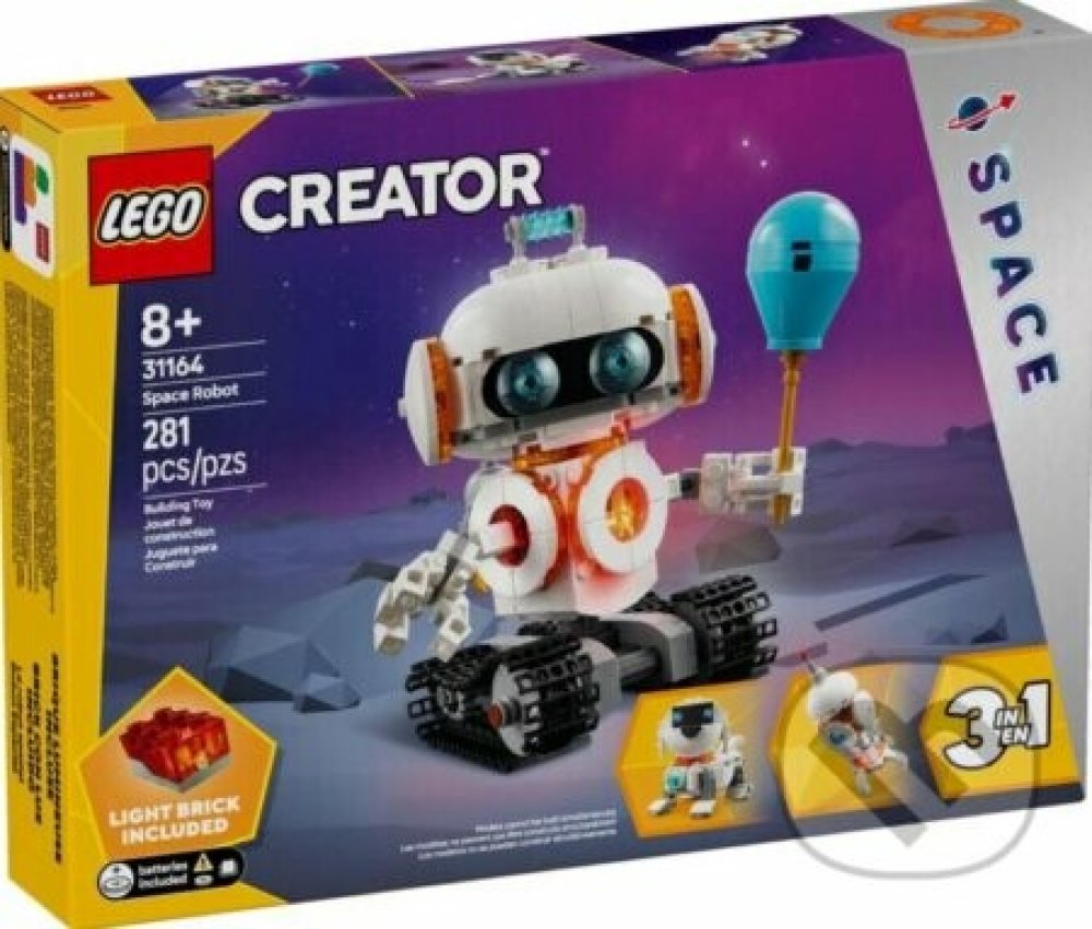 Kluci a holky od 8 let si přehrají příběhy z hvězd s vědeckou stavebnicí Vesmírný robot. Tento model robota pro děti má pohyblivé pásy a jetpack, otáčecí tělo a hlavu, pohyblivé paže a prsty, balón a světelnou kostku, která osvětluje jeho trup. Fanoušci LEGO můžou stavět a přestavovat 3 různé akční vesmírné modely ze stejných kostek: robota na pohyblivých pásech, pohyblivou figurku vesmírného psa s kostí a létajícím diskem nebo vesmírnou raketu. Všechny 3 modely představují parádní dárky s vesmírnou tematikou, se kterými si děti užijí spoustu zábavy. Stisknutím světelné kostky (baterie jsou součástí balení) děti model rozsvítí.