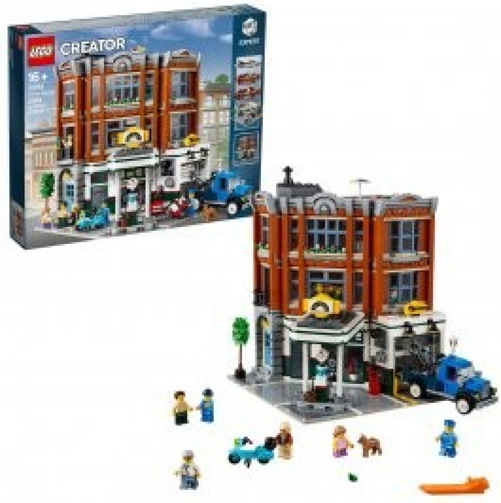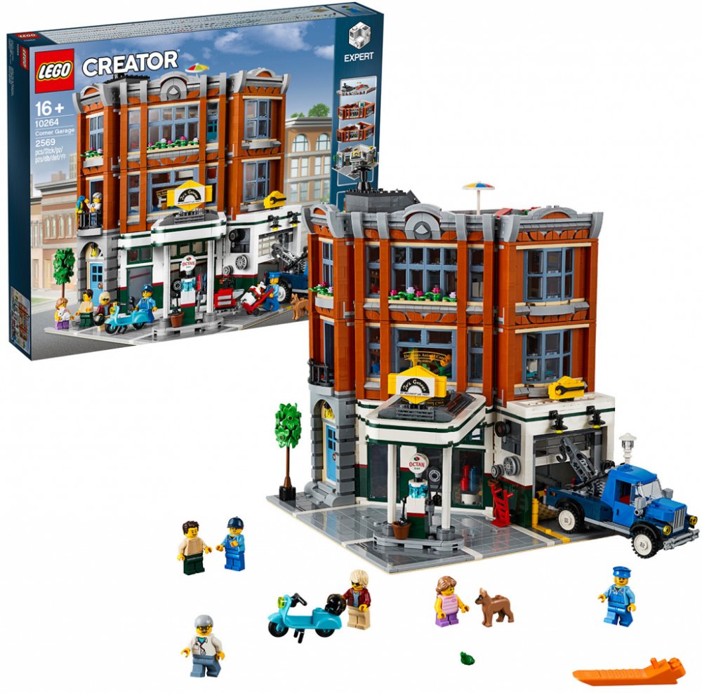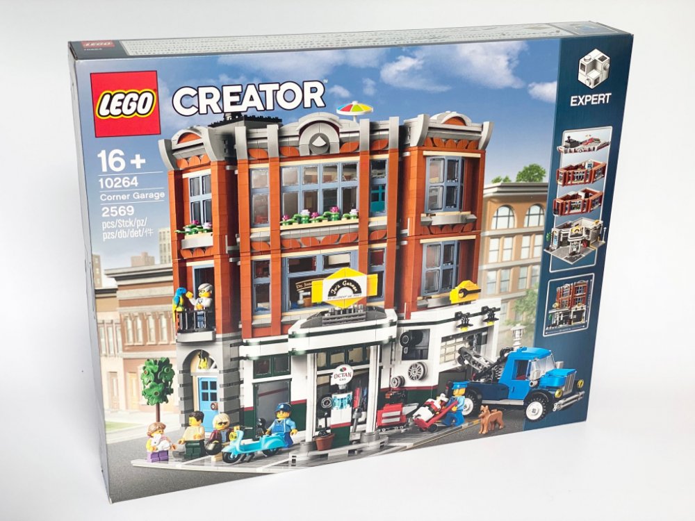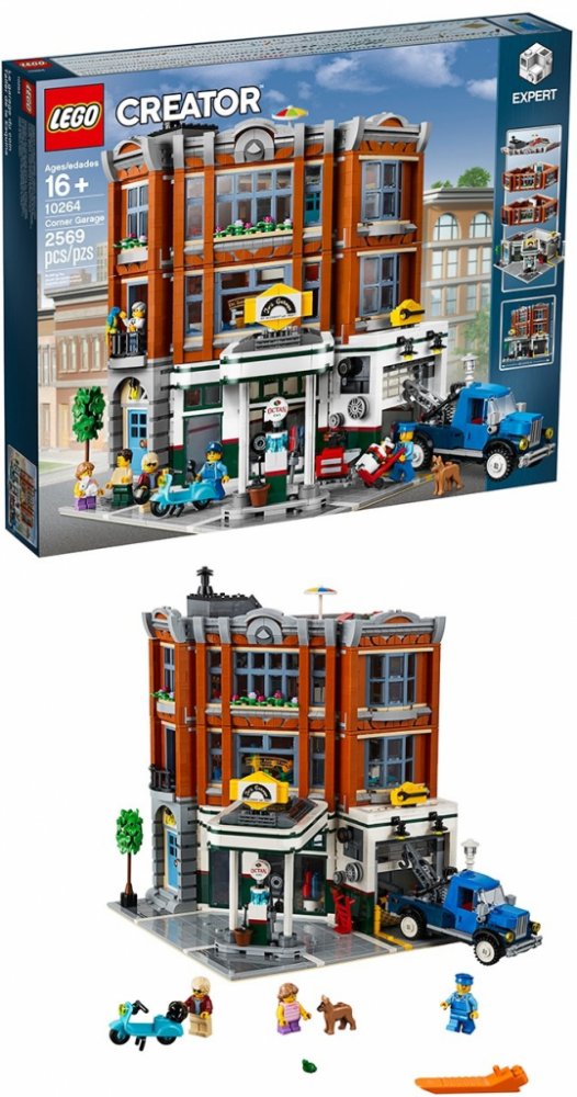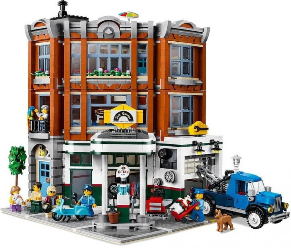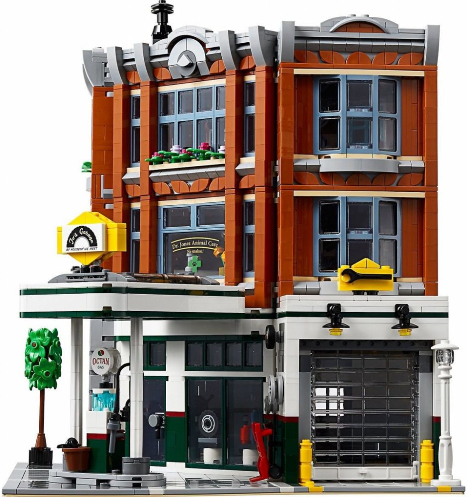 • Třípatrový dům s rohovou garáží má spoustu detailních prvků postavených z kostek, včetně krásné fasády ve stylu roku 1950 s cedulí čerpací stanice, okny, arkýřovými okny, klenutým vchodem, rolovacích dveří autodílny, dekorativní střechy a střešní terasy, a navíc obsahuje i detailní chodník se stromem a zdobenou lampou. Stavebnice dále nabízí také odtahový vůz a skútr.