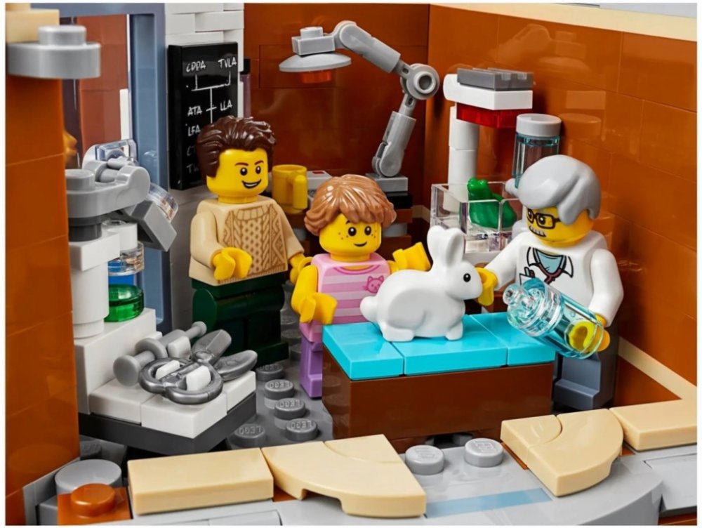 • Prostřední patro nabízí veterinární kliniku s vyšetřovacím stolem, papouškem na bidýlku, akváriem a čekárnou s pohovkou, křeslem, stolem a květináčem, a navíc stolní lampu, mikroskop, hrnek, noviny, obálku, nůžky a stříkačku veterináře.