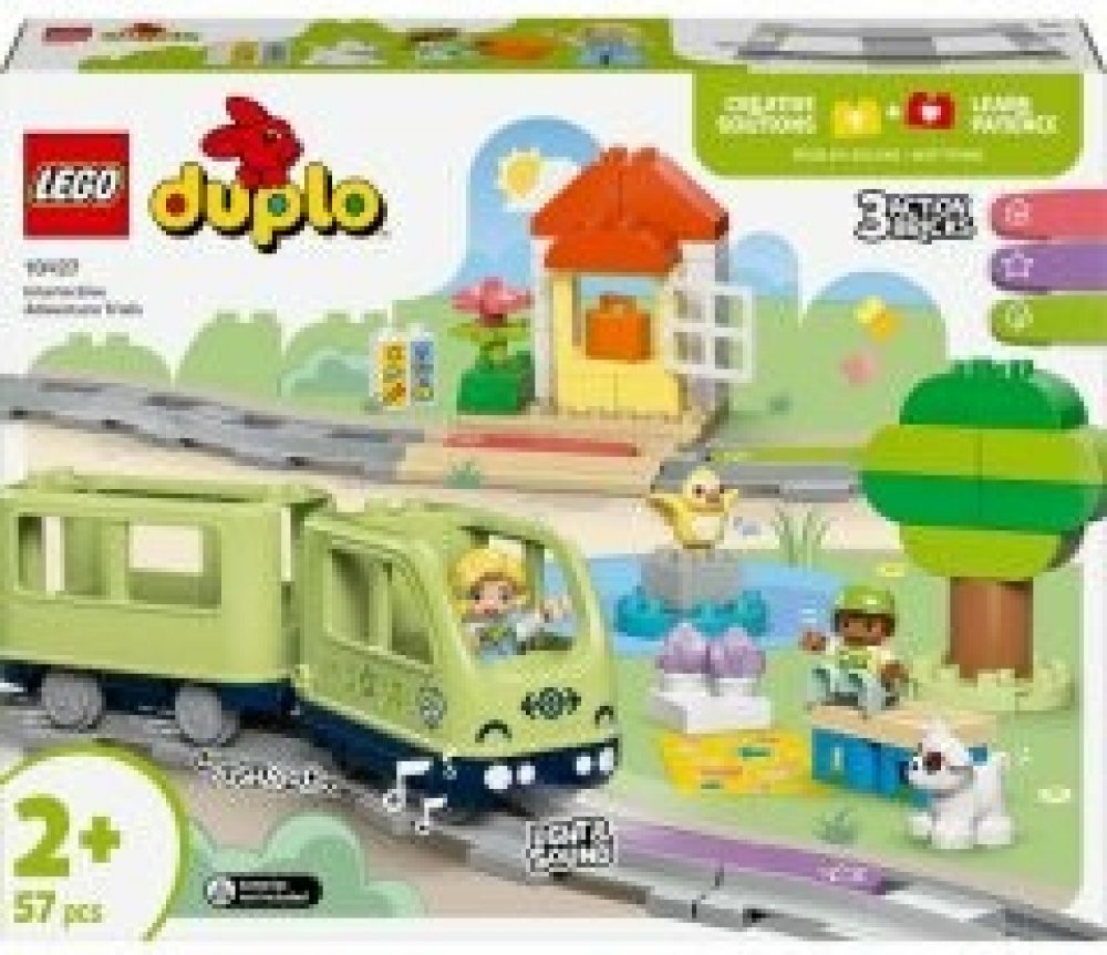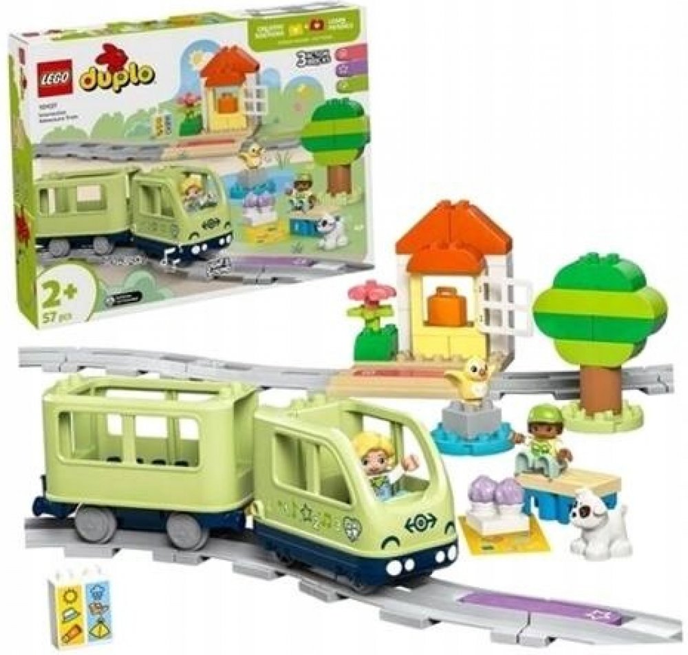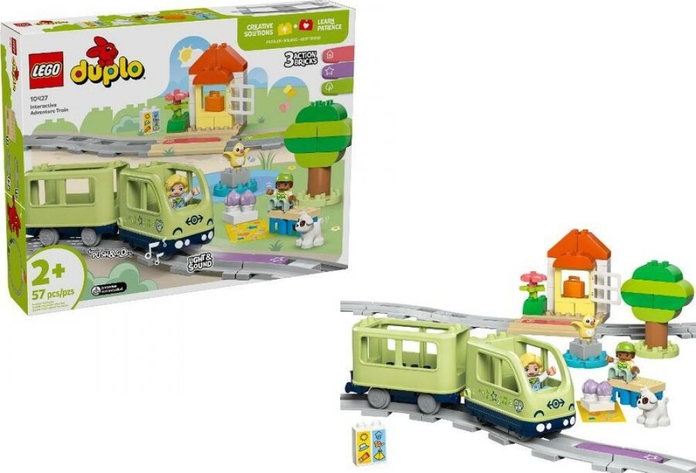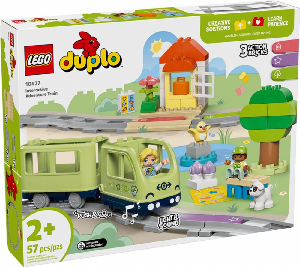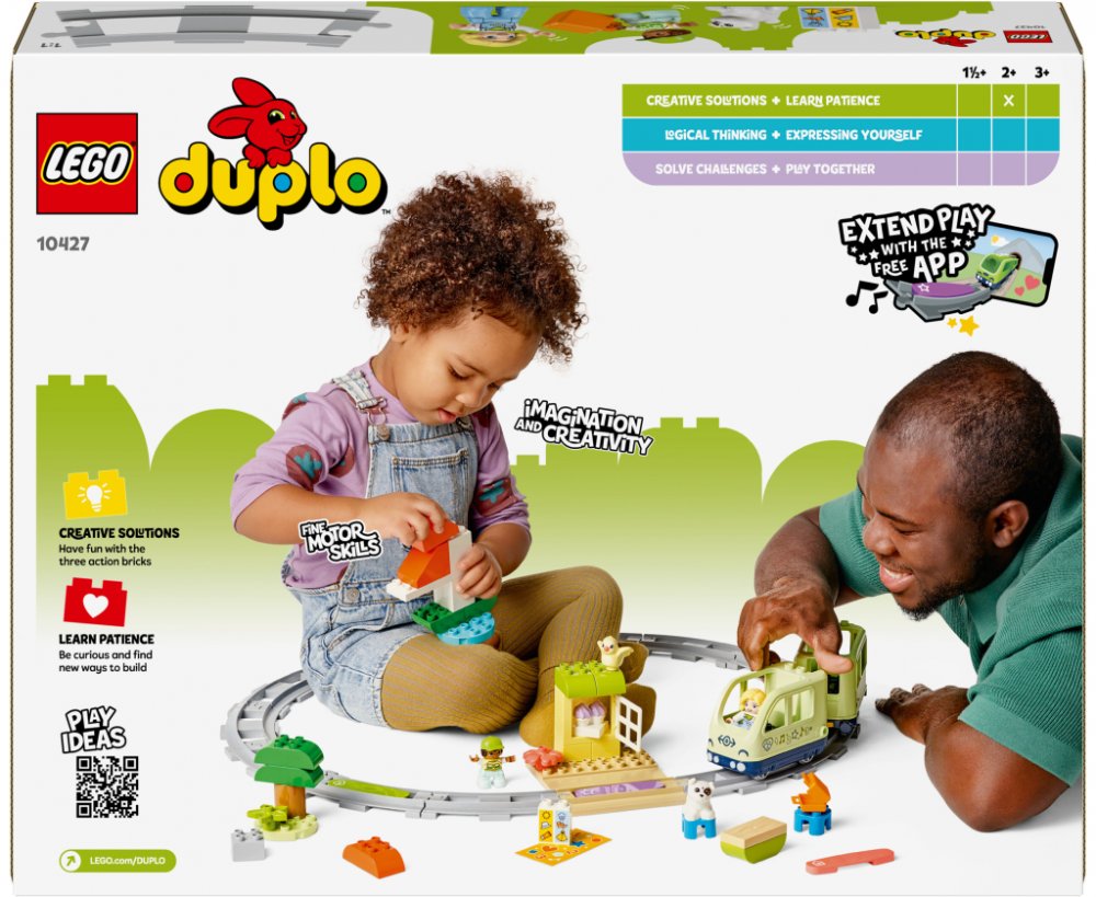 Dospělí můžou dětem ukázat, jak vypadá výběr destinace rodinného výletu, a vyrazit s nimi na trať plnou světel, zvuků a objevování. K dispozici jsou dílky na stavění parku, pláže, železniční stanice i rodinného domu. Tři akční kostky oživí hru – když kolem nich projede vlak, zazní realistické zvuky. Nechybí ani speciální přizpůsobitelná kostka, která přehraje vlastní nahrané zvuky přes aplikaci LEGO® DUPLO® Interactive Trains; ta navíc umožňuje řídit vlak pomocí přenosného elektronického zařízení.
