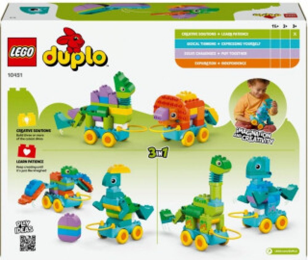 LEGO® DUPLO® 10451 3 v 1: Dinosauři na kolečkách je stavebnice určená pro malé děti, které rády objevují svět zvířat, pohybu a jednoduchého stavění. Díky konceptu 3 v 1 mohou děti sestavit různé varianty dinosaurů a zkoušet, jak se mění jejich podoba i způsob hry. Větší kostky řady DUPLO® jsou snadno uchopitelné a přizpůsobené malým rukám, což podporuje samostatnou h...
