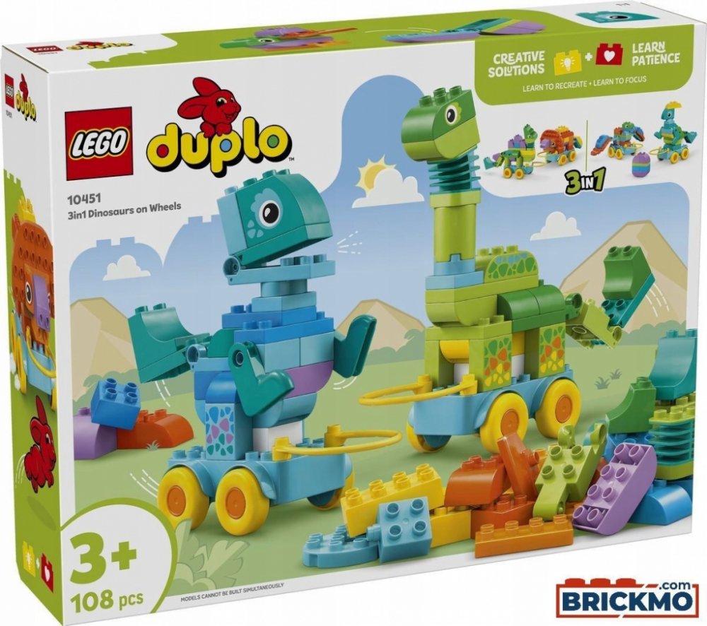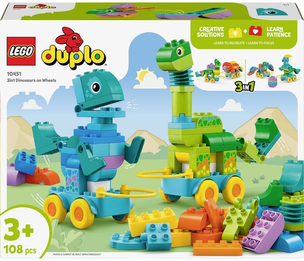 LEGO® DUPLO® 10451 3 v 1: Dinosauři na kolečkách je stavebnice určená pro malé děti, které rády objevují svět zvířat, pohybu a jednoduchého stavění. Díky konceptu 3 v 1 mohou děti sestavit různé varianty dinosaurů a zkoušet, jak se mění jejich podoba i způsob hry. Větší kostky řady DUPLO® jsou snadno uchopitelné a přizpůsobené malým rukám, což podporuje samostatnou hru i první pokusy o kreativní kombinování dílků. Pohyblivá kolečka dodávají modelům dynamiku a umožňují dětem rozvíjet představivost při hraní vlastních příběhů. LEGO® stavebnice v tomto provedení spojuje jednoduchost s možností opakovaného přestavování, což udržuje dětský zájem po dlouhou dobu.