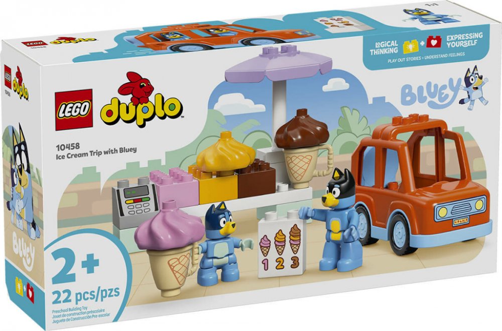LEGO 10458 - Bluey a zmrzlina z produktové řady LEGO DUPLO. Kvalitní dětská plastová stavebnice, 22 dílků v krabici.