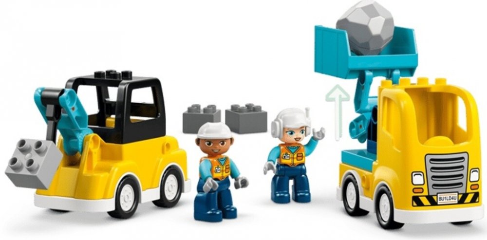 Stavebnice je navržena v charakteristických barvách série DUPLO – převládá žlutá, modrá a oranžová, což přispívá k atraktivitě a snadné rozpoznatelnosti jednotlivých vozidel. Vozidla jsou navíc doplněna o dvě figurky stavebních dělníků, které děti mohou používat při imaginární hře, čímž se hra stává interaktivnější a přibližuje se reálným situacím na staveništi. Díky velkým, snadno uchopitelným dílkům je stavebnice bezpečná a vhodná pro malé ručičky.