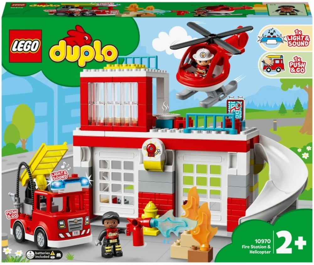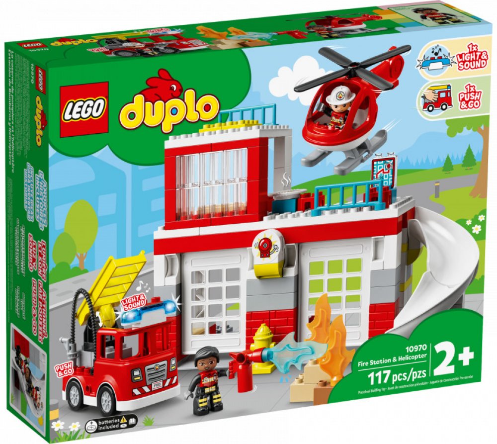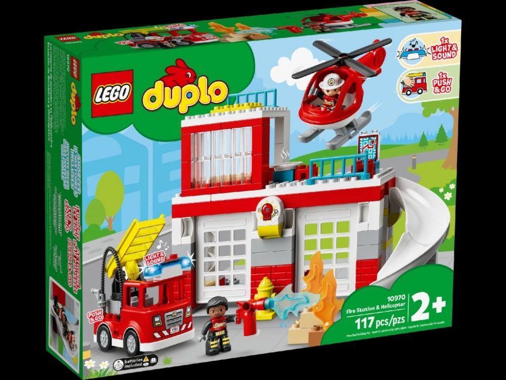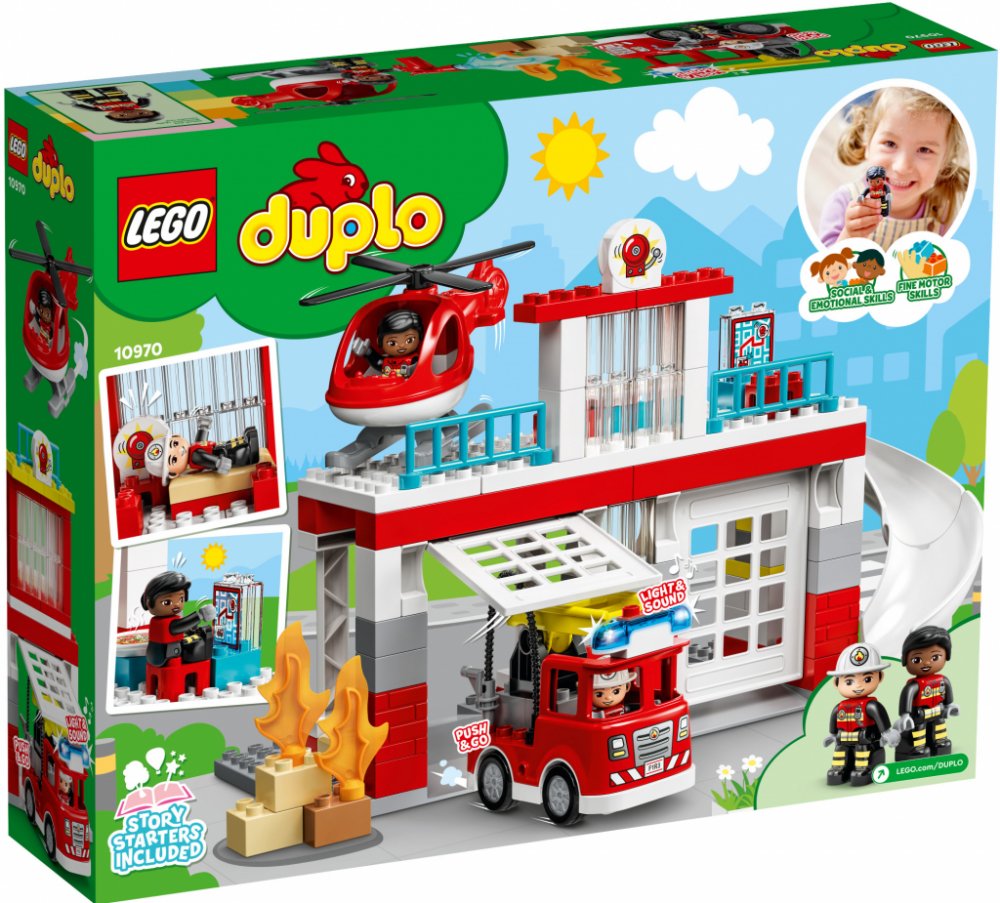 Další rušný den na hasičské stanici. Tým požárníků sviští dolů po skluzavce, nasedá do hasičského vozu a vyjíždí ven s blikajícími světly a zapnutou sirénou (baterie jsou součástí balení) velkými vyklápěcími dveřmi. Na střeše startuje vrtulník, aby se také mohl zapojit do mise. Až bude po všem, je čas na hasičské cvičení, zaslouženou pizzu a odpočinek v posteli – vše je připraveno na další rušný den. Sada určená speciálně pro předškoláky doslova překypuje herními možnostmi podporujícími rozvoj jemné motoriky, empatie a dalších důležitých dovedností. Děti se zároveň mohou bezpečným způsobem seznámit s prací hasičů.