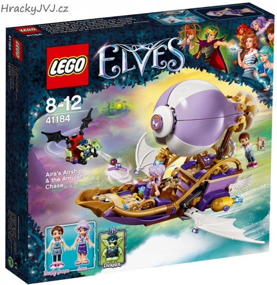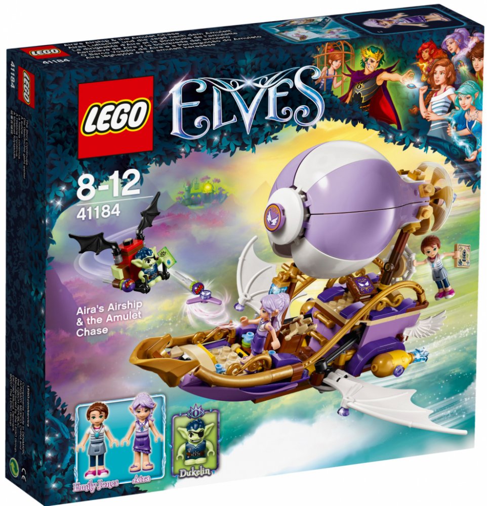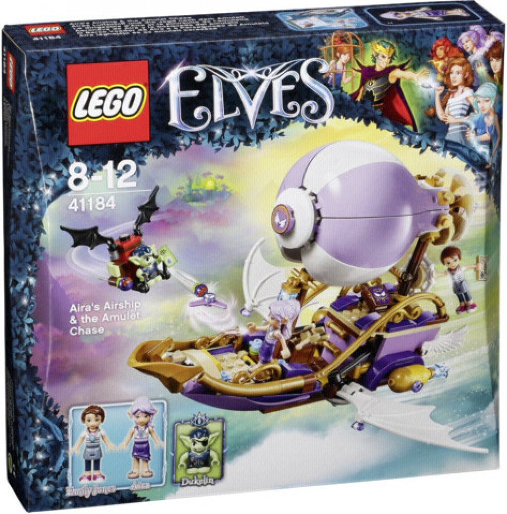 Připoj se k napínavým novým dobrodružstvím ve světě Elvendale, kde se Emily Jonesová a větrná elfka Aira Ševelilka snaží najít Emilin ztracený amulet a také její sestru, Sofii Jonesovou. Létej v Aiřině vzducholodi s otáčecí vrtulí, prostorem pro dvě minifigurky-panenky, roztažnými křídly a kuší, a vyhni se skřetovi Dukelinovi na jeho skřetím kluzáku s pohyblivými křídly, vystřelovači zlých semínek a otevíracím poklopem s malým úložným prostorem. Součástí sady jsou dvě minifigurky-panenky a navíc skřet.