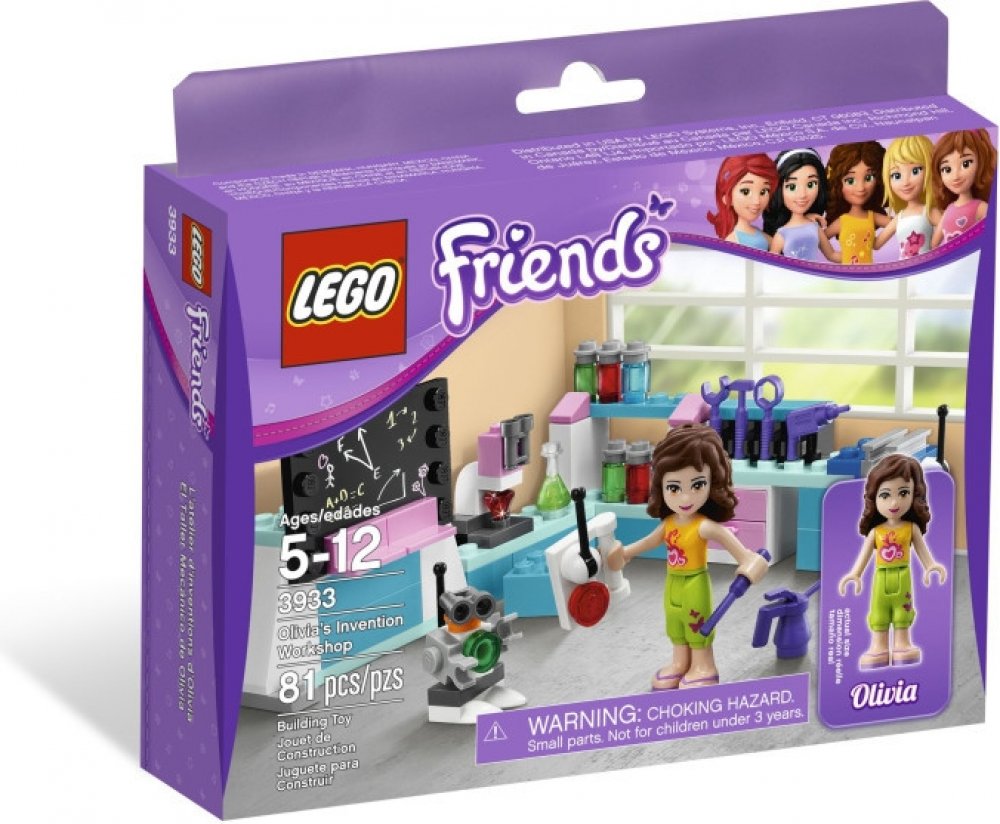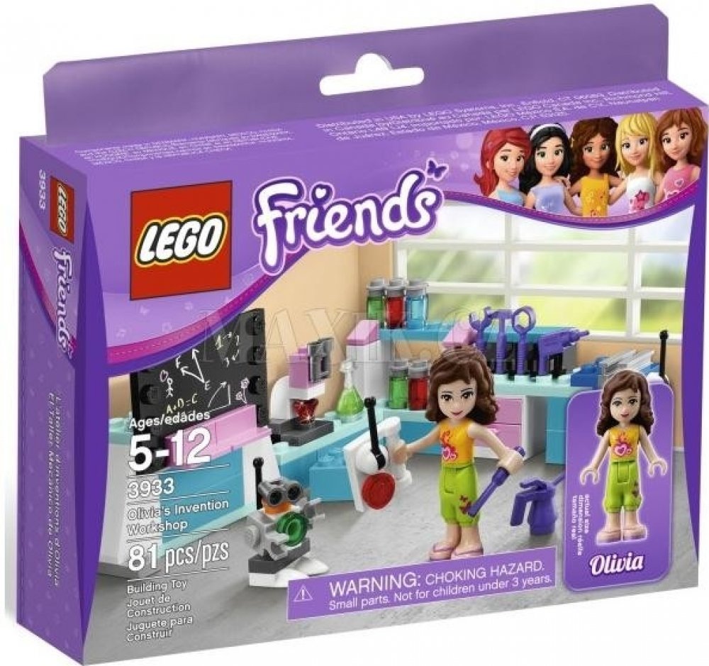 Lego Friends 3933 Olivia ve svojí dílně Novinka pro děvčata! Olivia ráda experimentuje se svými hračkami a vymýšlí nové výtvory. Napíše si svůj plán na tabuli, pozoruje krystaly pod mikroskopem a používá nejrůznější nářadí s pomocí svěráku či pracovního ponku. Když má hotovo, uloží svůj výrobek do regálů k ostatním. Vyprav se za Olivií do její dílny a pomoz jí sestavit dálkově ovládaného robota. Minipanenky LEGO jsou speciálně upravené pro svět LEGO Friends, které nabízejí bezpočet různých vlasových a módních úprav. Obsahuje minifigurku-panenku Olivie. Součástí je pracovní ponk, mikroskop, tabule pro psaní křídou, malý regál a robot na ovládání. Mezi doplňky patří elektrické nářadí, krystal, chemické nádoby a plechovka s olejem. Pracovní ponk měří přes 4 cm na výšku a 6 cm na šířku. Regálový systém měří přes 5 cm na výšku a 4 cm na šířku. Vhodné pro děti od 5 do 12 let. V balení naleznete 81 dílků. Olivia je tvrdohlavá vynálezkyně. Je dobrá ve čtení z map, navigaci podle hvězd, stavění věcí a vyzná se v počítači. Má ráda své přátele, vědu, školu, kreslení, přírodu, turistiku, fotografování a historii. Jejím mazlíčkem je kočka Missy. Oblíbeným jídlem je všechno co jde ugrilovat.